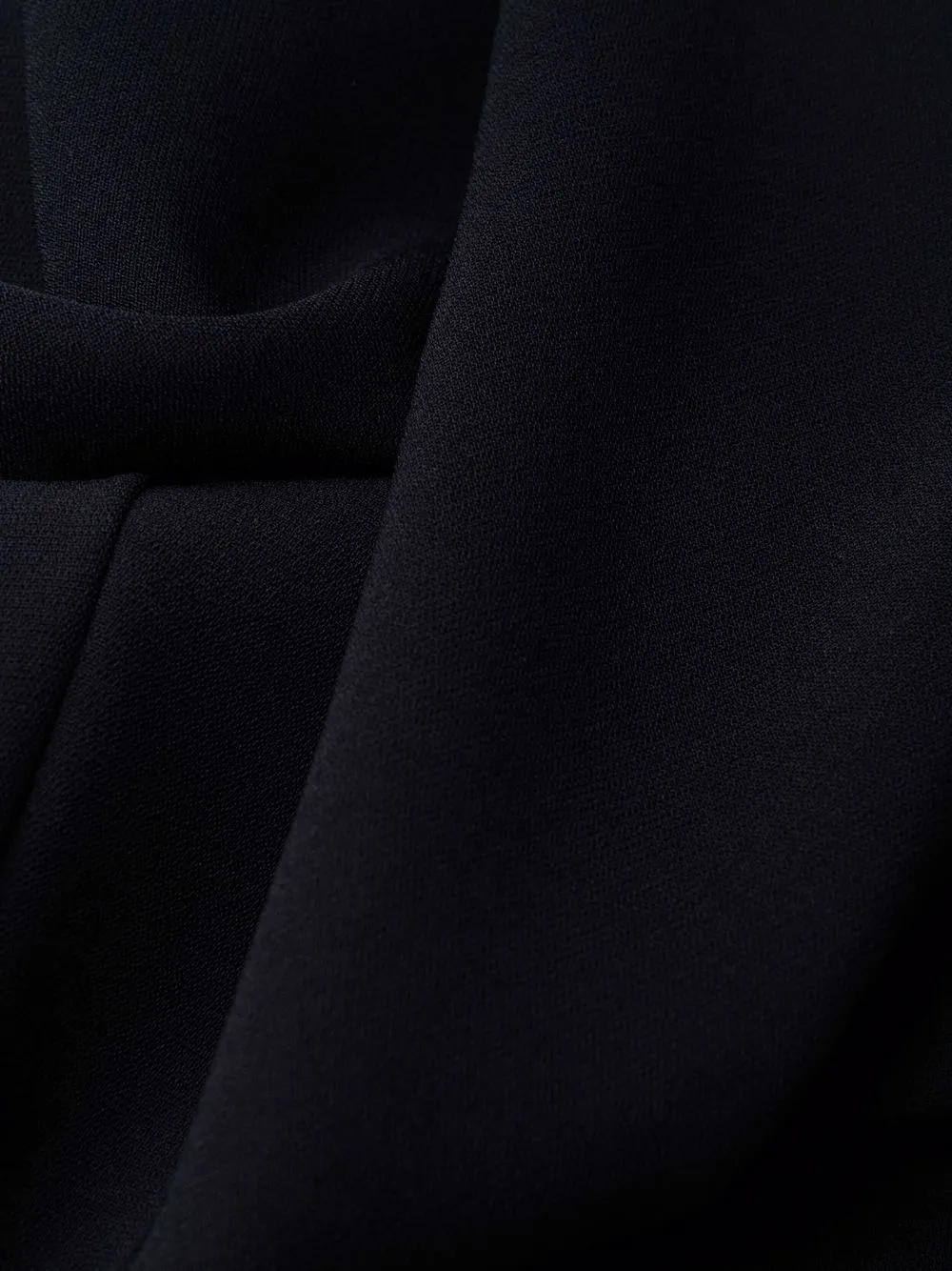 Застежка на молнии сбоку, прорезные карманы по бокам и подвернутые манжеты.