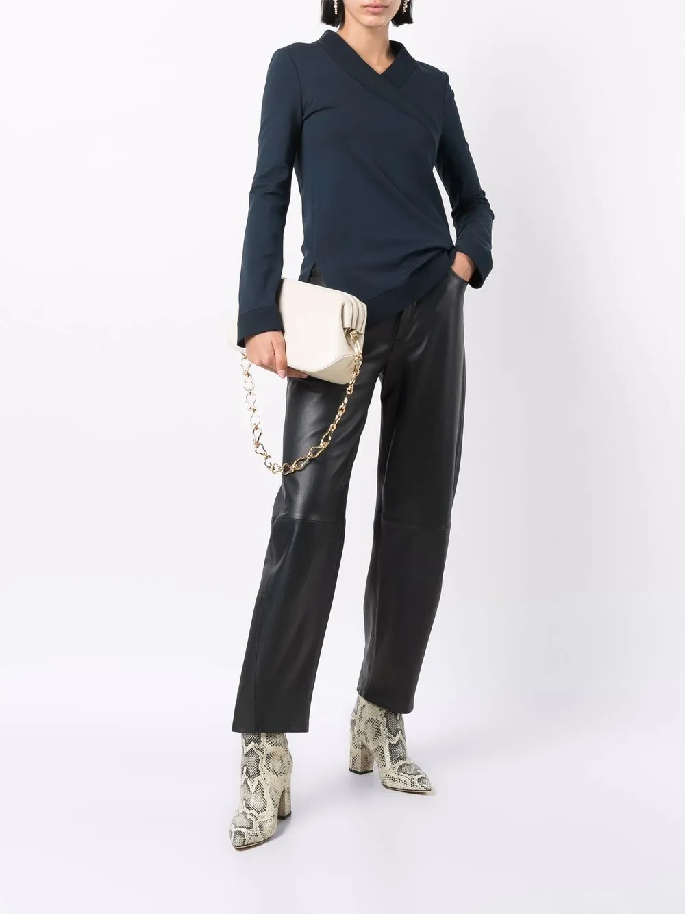 Боковые разрезы, V-образный вырез, длинные рукава и прямой подол.