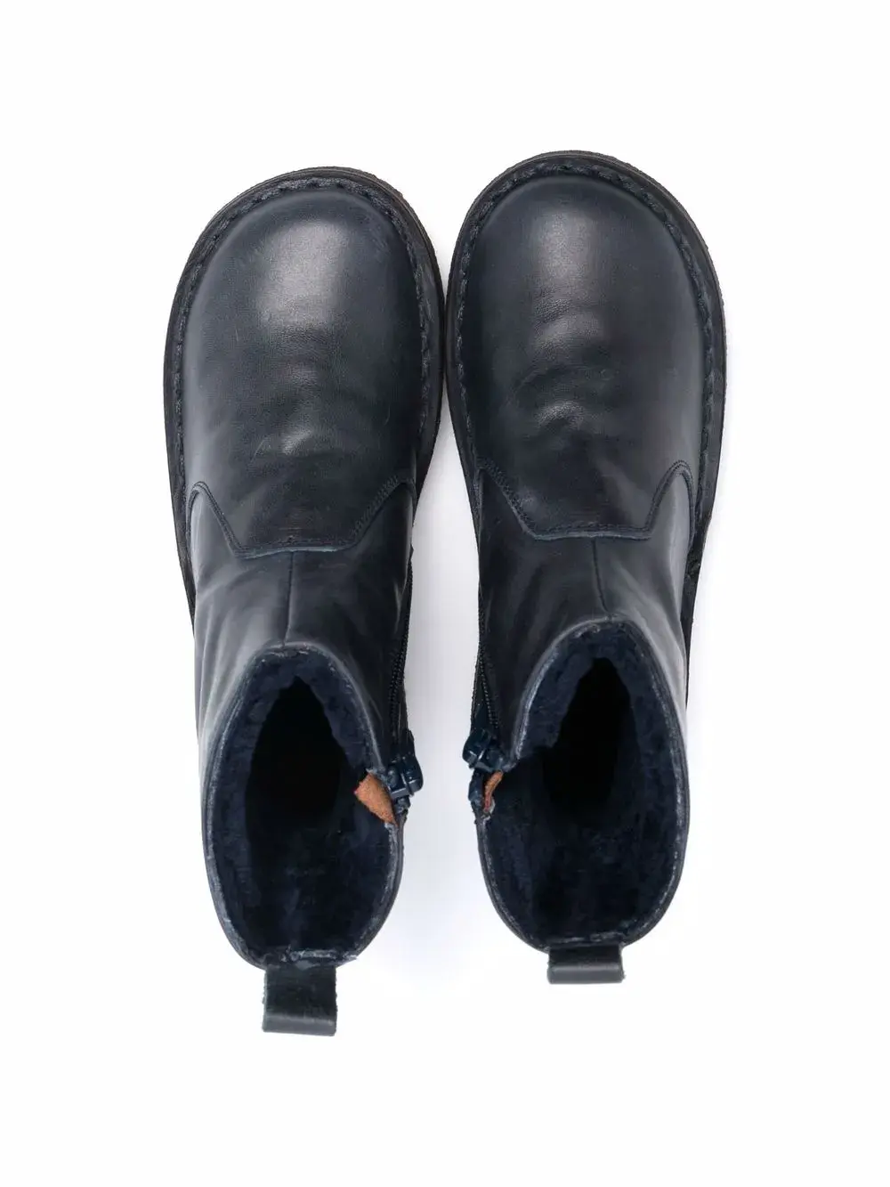 Синий, телячья кожа, застежка на молнии сбоку, длина по щиколотку, закругленный носок, плоская резиновая подошва и стелька с логотипом.