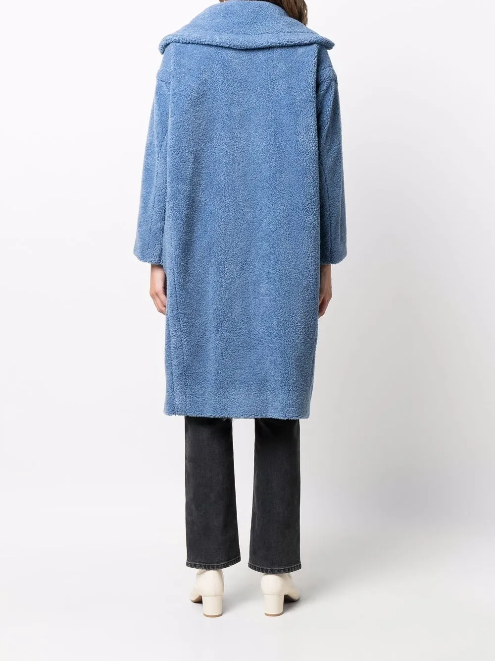 Отделка из искусственной овчины, двубортная застежка на пуговицы, длинные рукава, классические лацканы и оправа оверсайз. Цвет: синий.