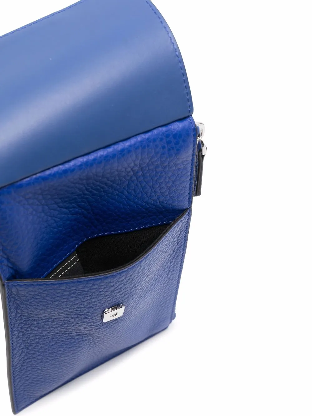 Металлический логотип, серебристая фурнитура, зернистая текстура, откидной клапан, основное отделение, застежка на молнии сверху и ремень на плечо. Цвет: синий.
