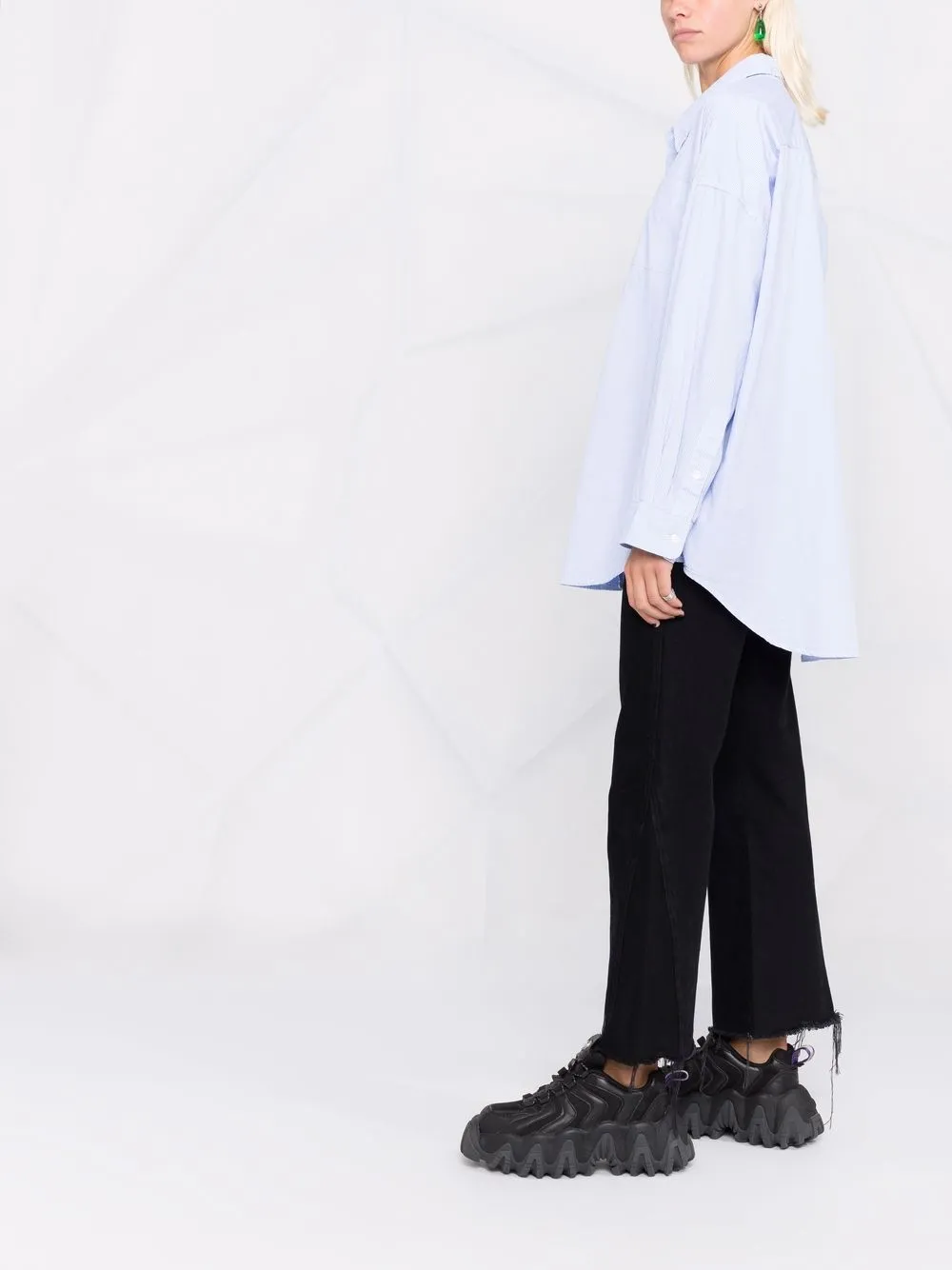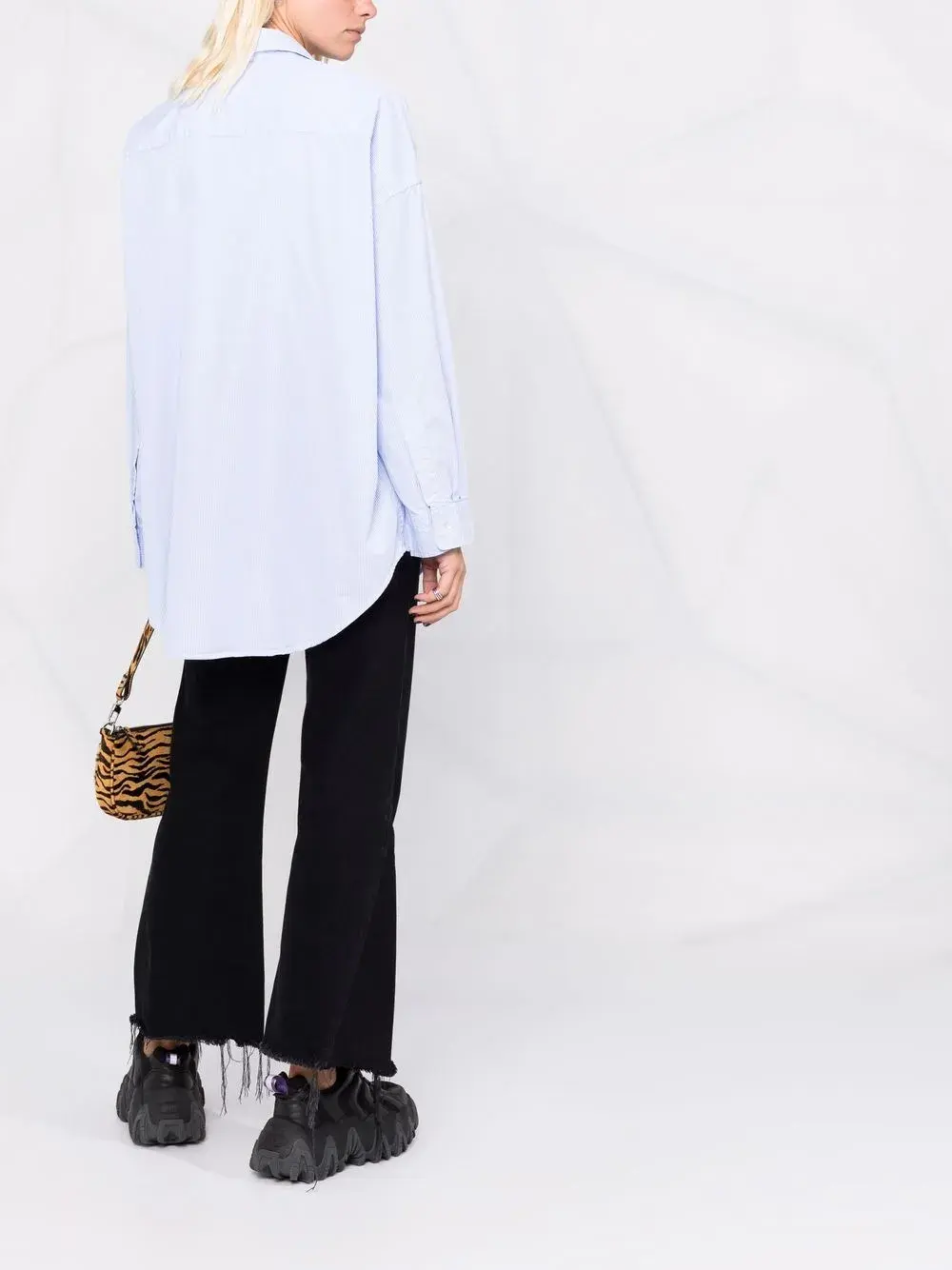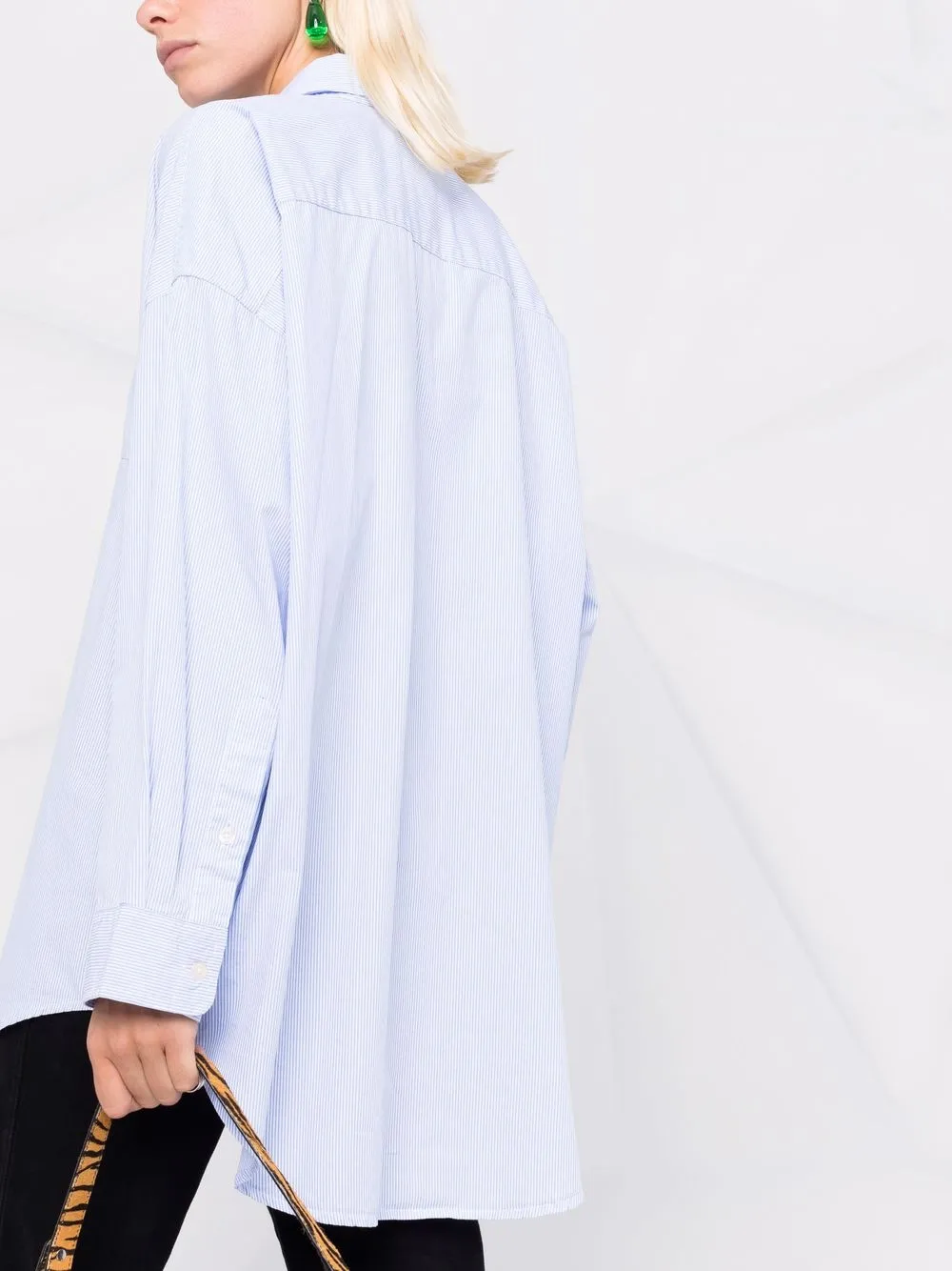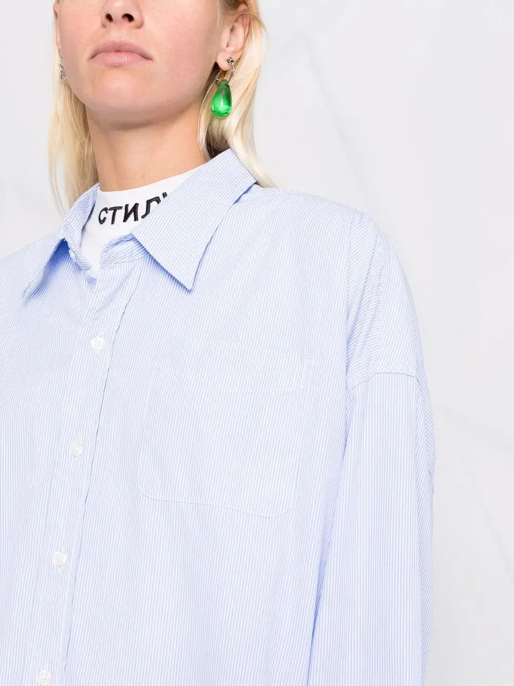 Узор в тонкую полоску, классический воротник, нагрудный накладной карман, застежка на пуговицах спереди, длинные рукава, манжеты на пуговицах и закругленный подол.