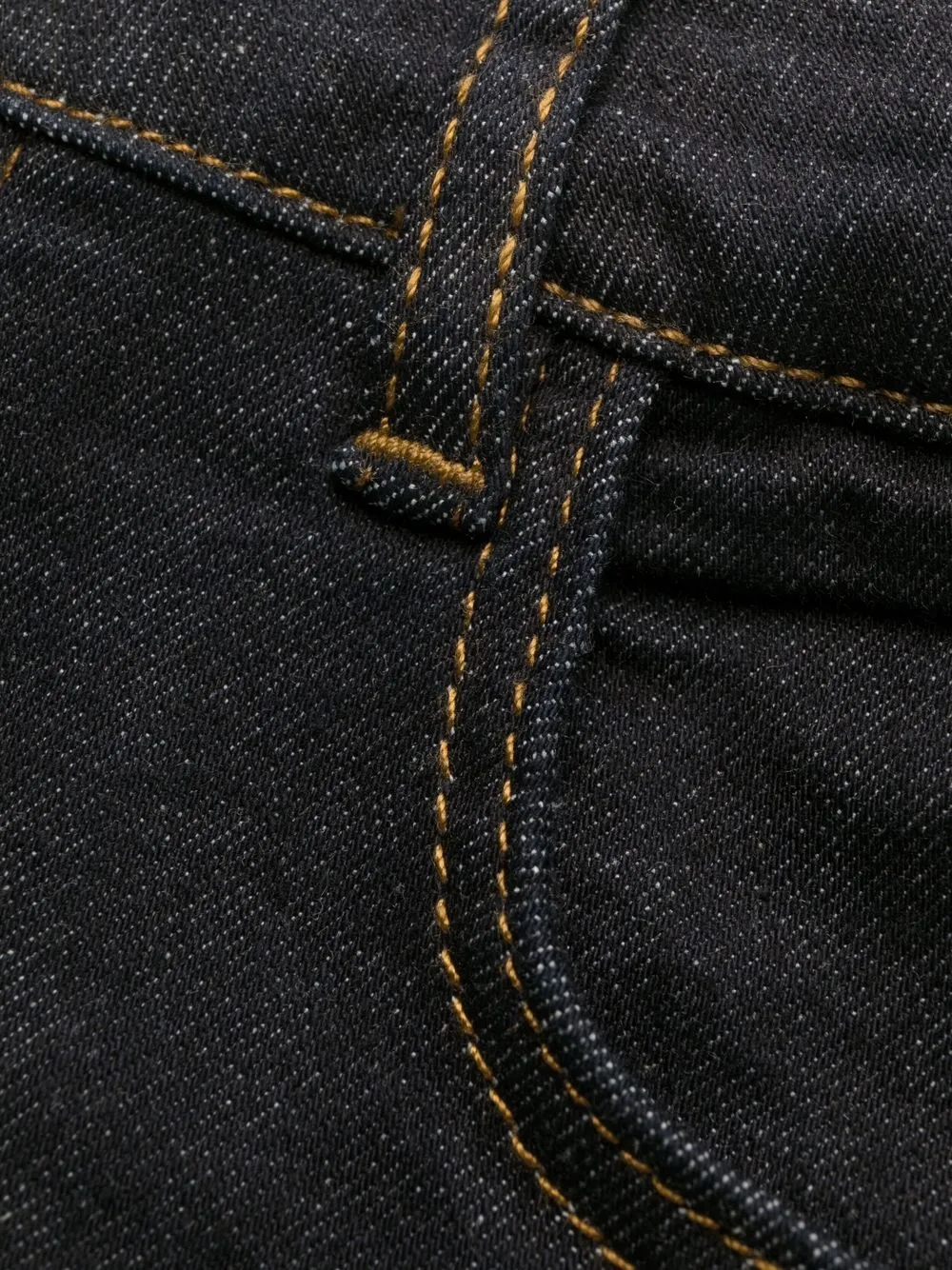 Вышивка с изображением черепа на тыльной стороне, облегающий крой, завышенная талия, застежка на молнии и пуговице спереди, петли для ремня, классическая пятикарманная модель и эластичная модель.