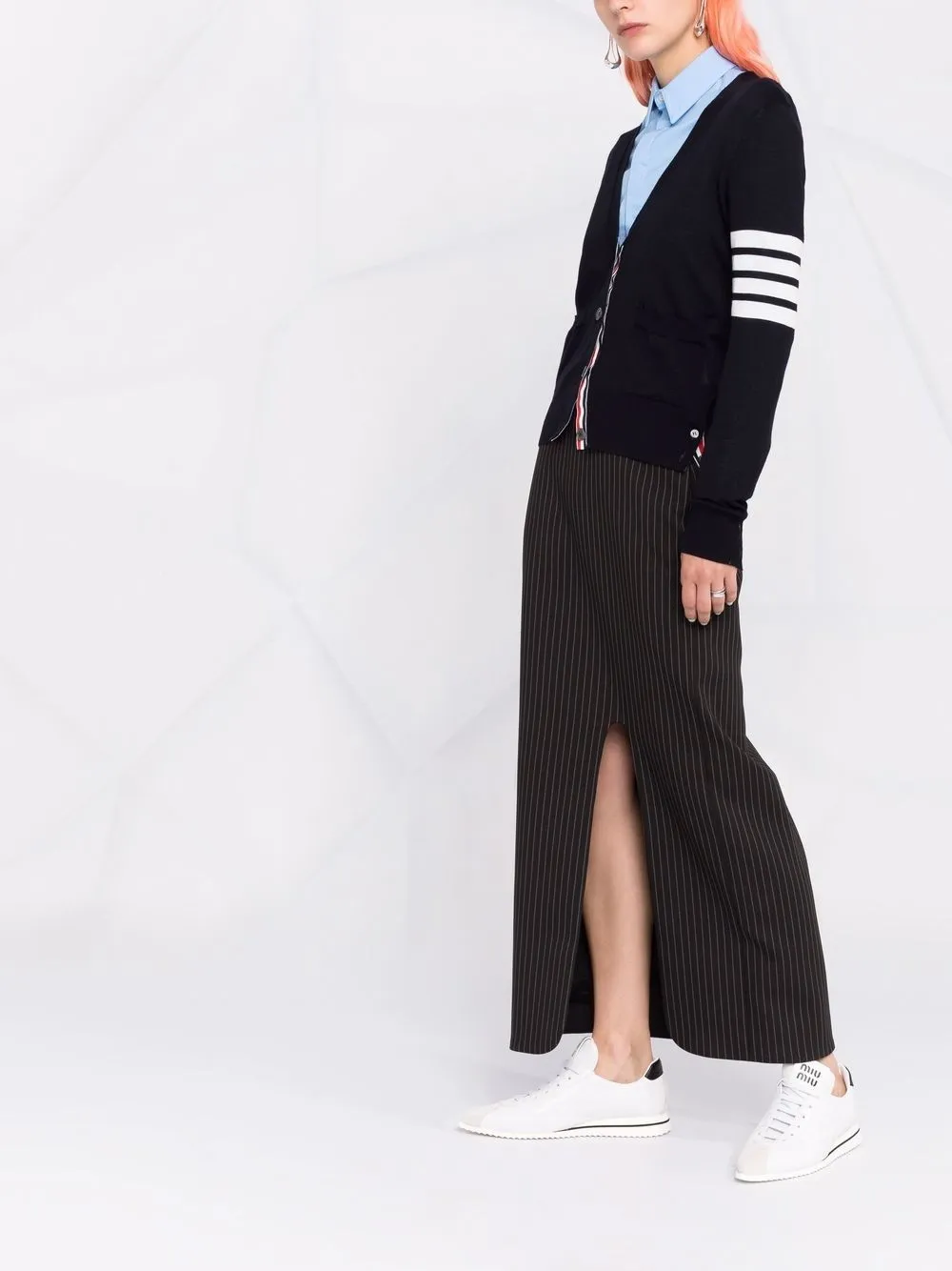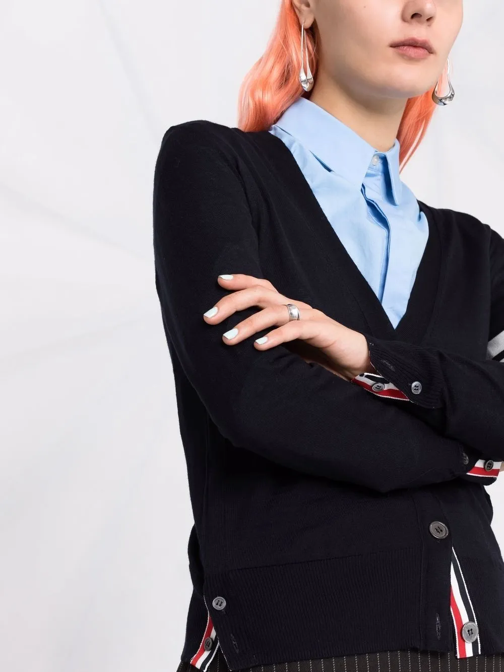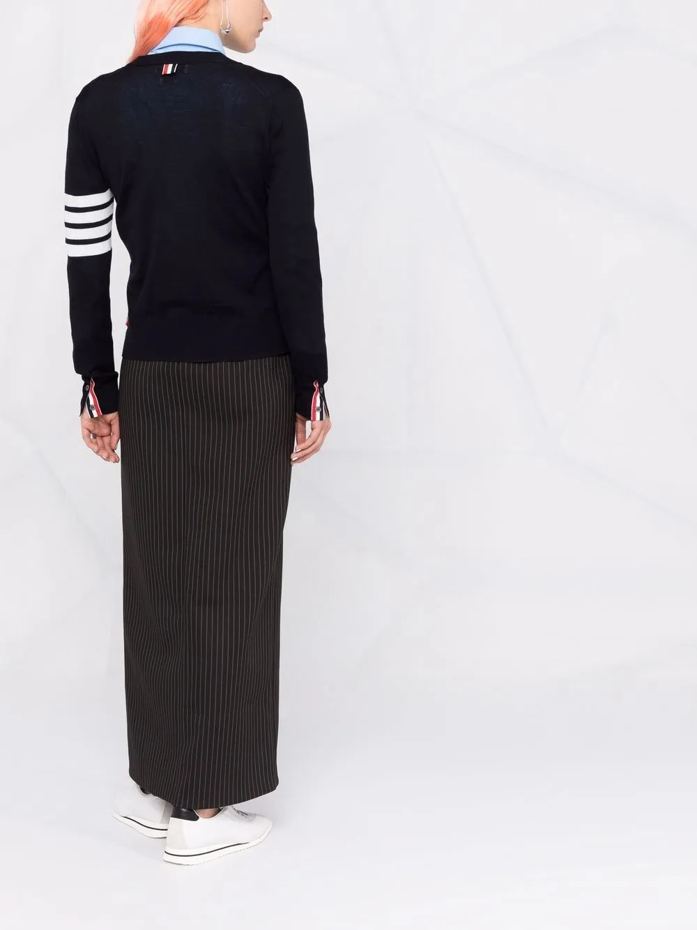 Тонкая вязка, полоски 4-Bar, отделка в полоску, V-образный вырез, застежка на пуговицах спереди, пуговичная застежка сбоку, длинные рукава, манжеты в рубчик, подол в рубчик и два накладных кармана спереди.