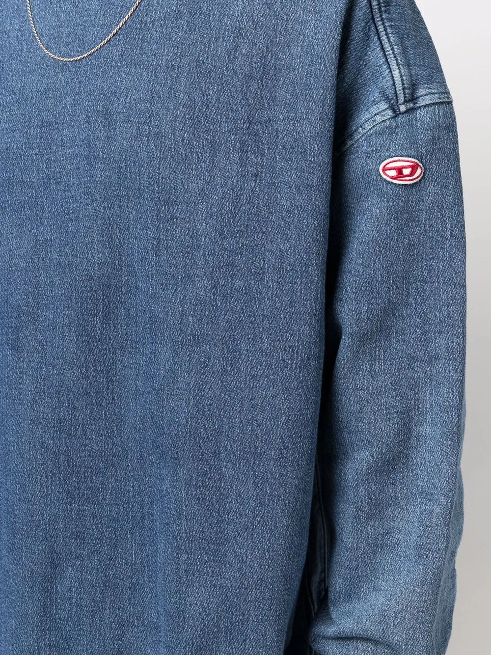 Нашивка с логотипом на рукаве, детали в рубчик, круглый вырез, длинные рукава и прямой подол.