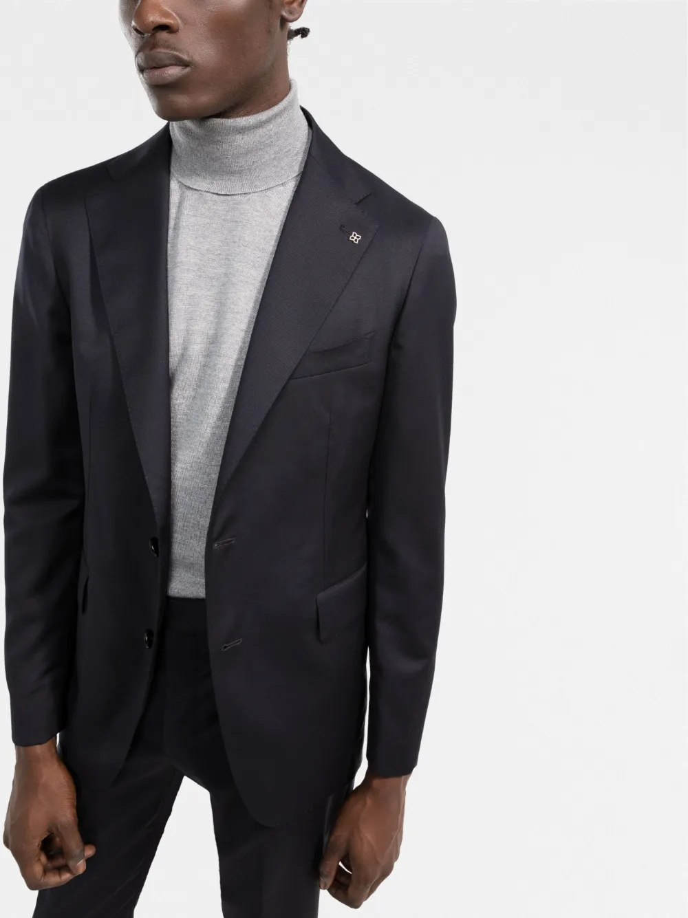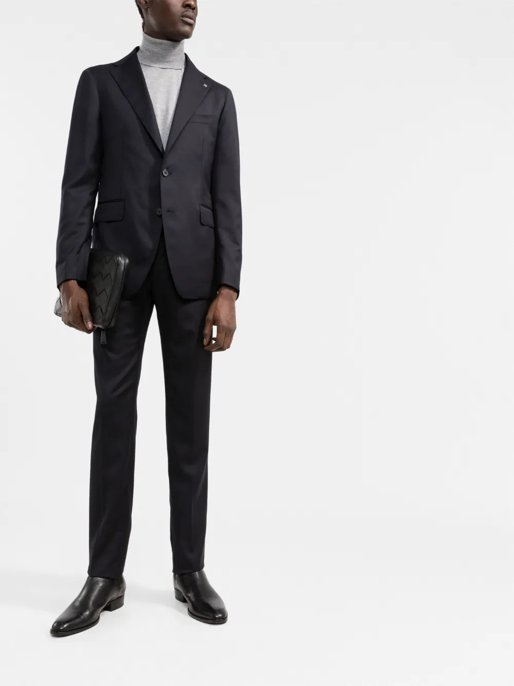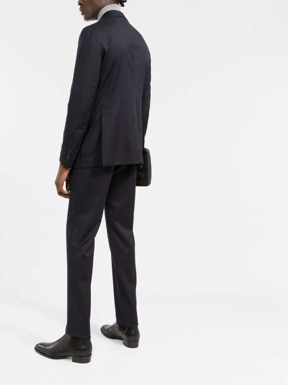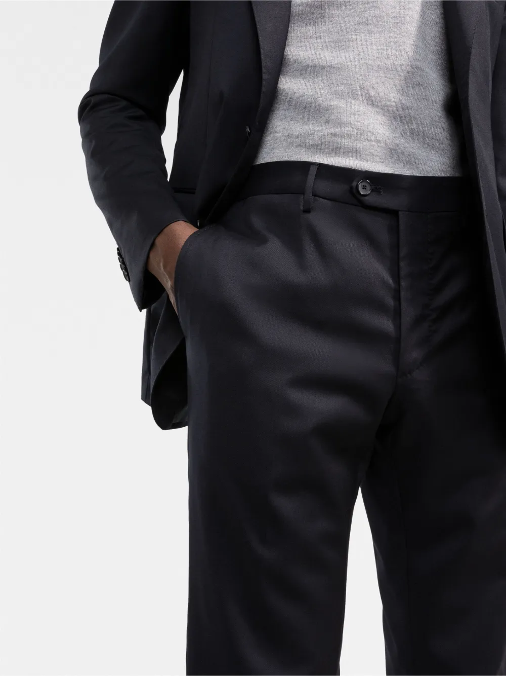 Зазубренные лацканы, прорезной карман на груди, застежка на пуговицах спереди, длинные рукава, манжеты на пуговицах, два передних кармана с клапанами, средняя посадка, ширинка на пуговицах, петли для ремня, два прорезных кармана по бокам, два кармана с листочкой сзади и узкий крой.