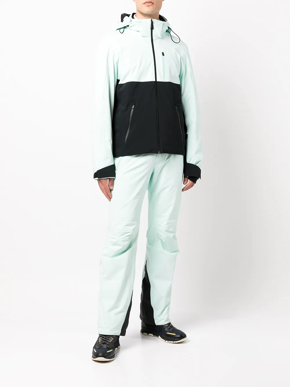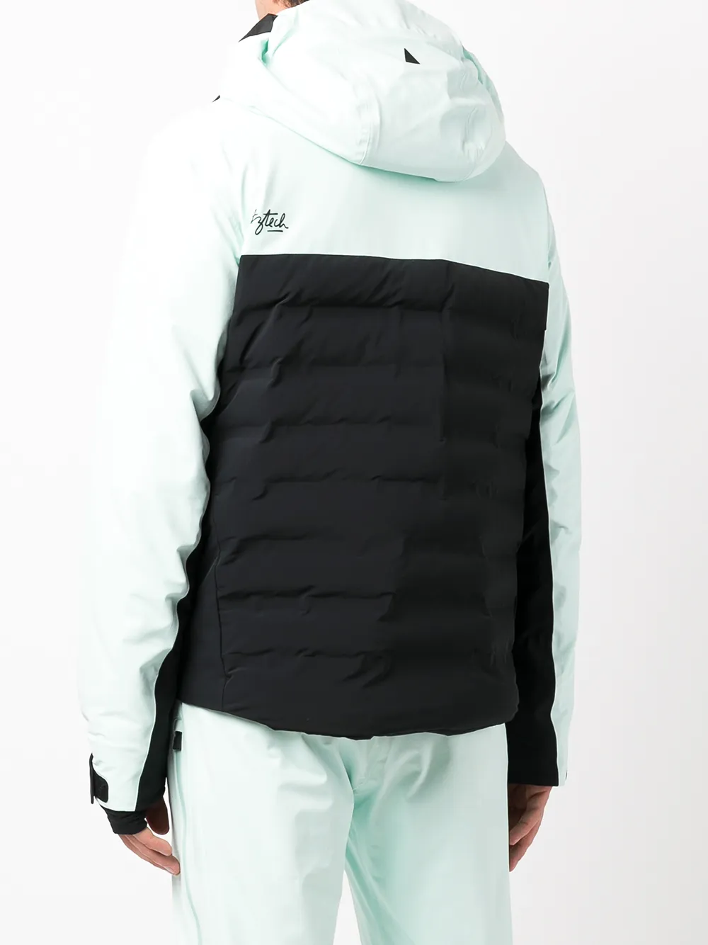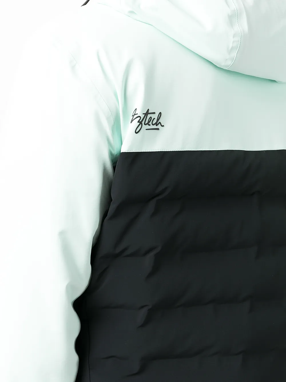 Стеганая отделка, стиль колор-блок, дутый материал, два кармана на молнии по бокам, застежка на молнии спереди, классический капюшон, длинные рукава, манжеты на липучках и прямой подол.