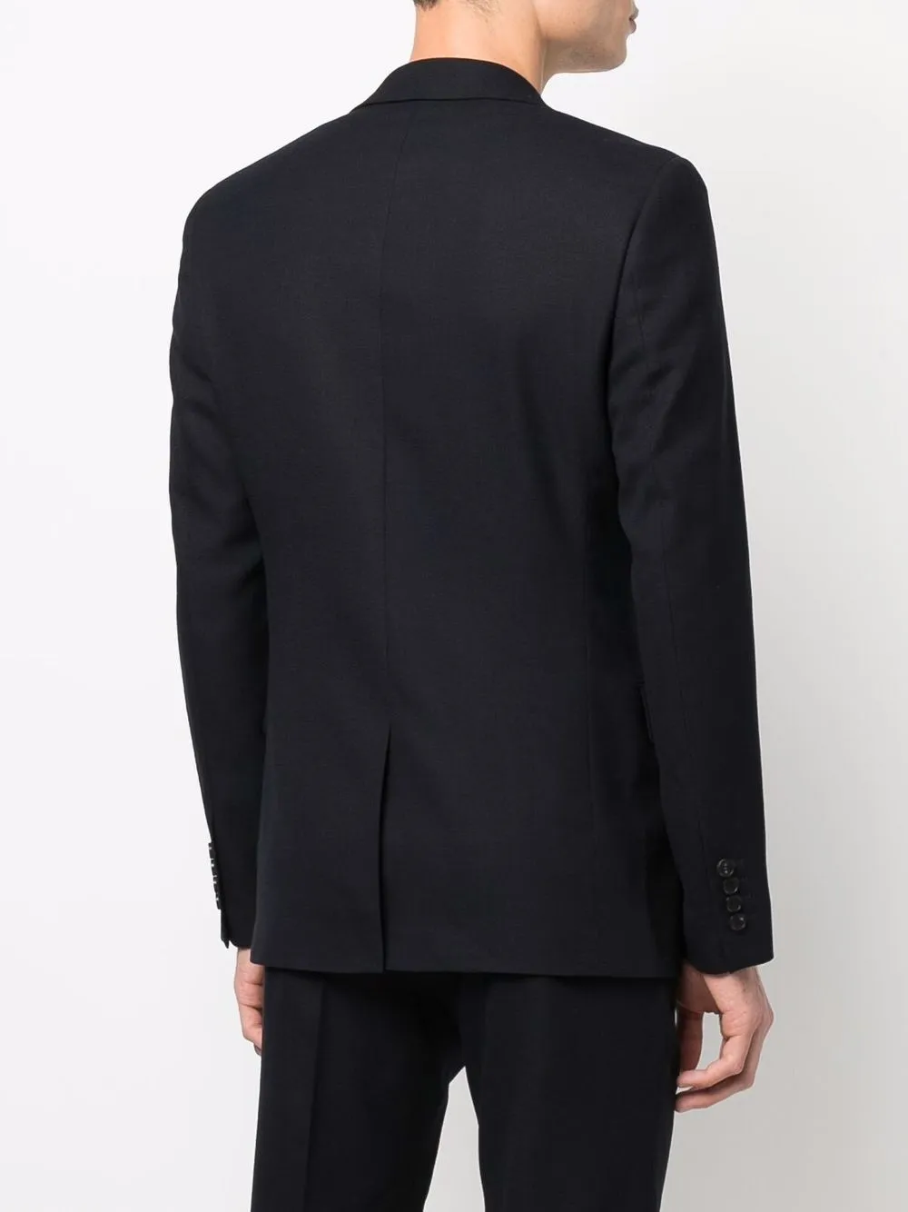 Узкие зазубренные лацканы, прорезной карман на груди, застежка на пуговицах спереди, два передних кармана с клапанами, длинные рукава, шлица по центру сзади и прямой подол.