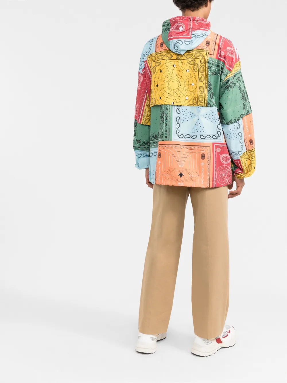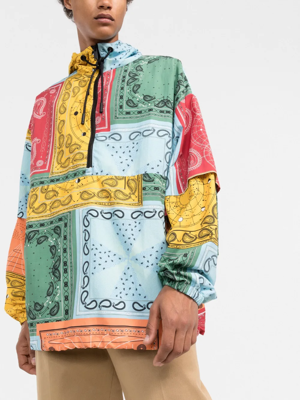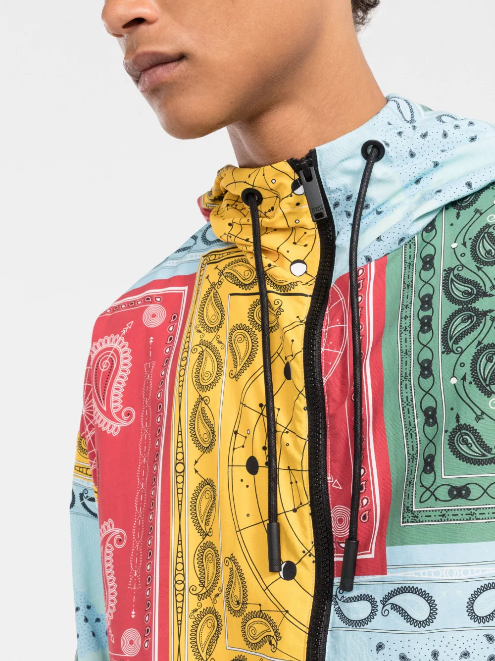 Техника пэчворк, узор пейсли, затягивающийся на шнурок капюшон, застежка на молнии спереди и длинные рукава. Цвет: разноцветный.
