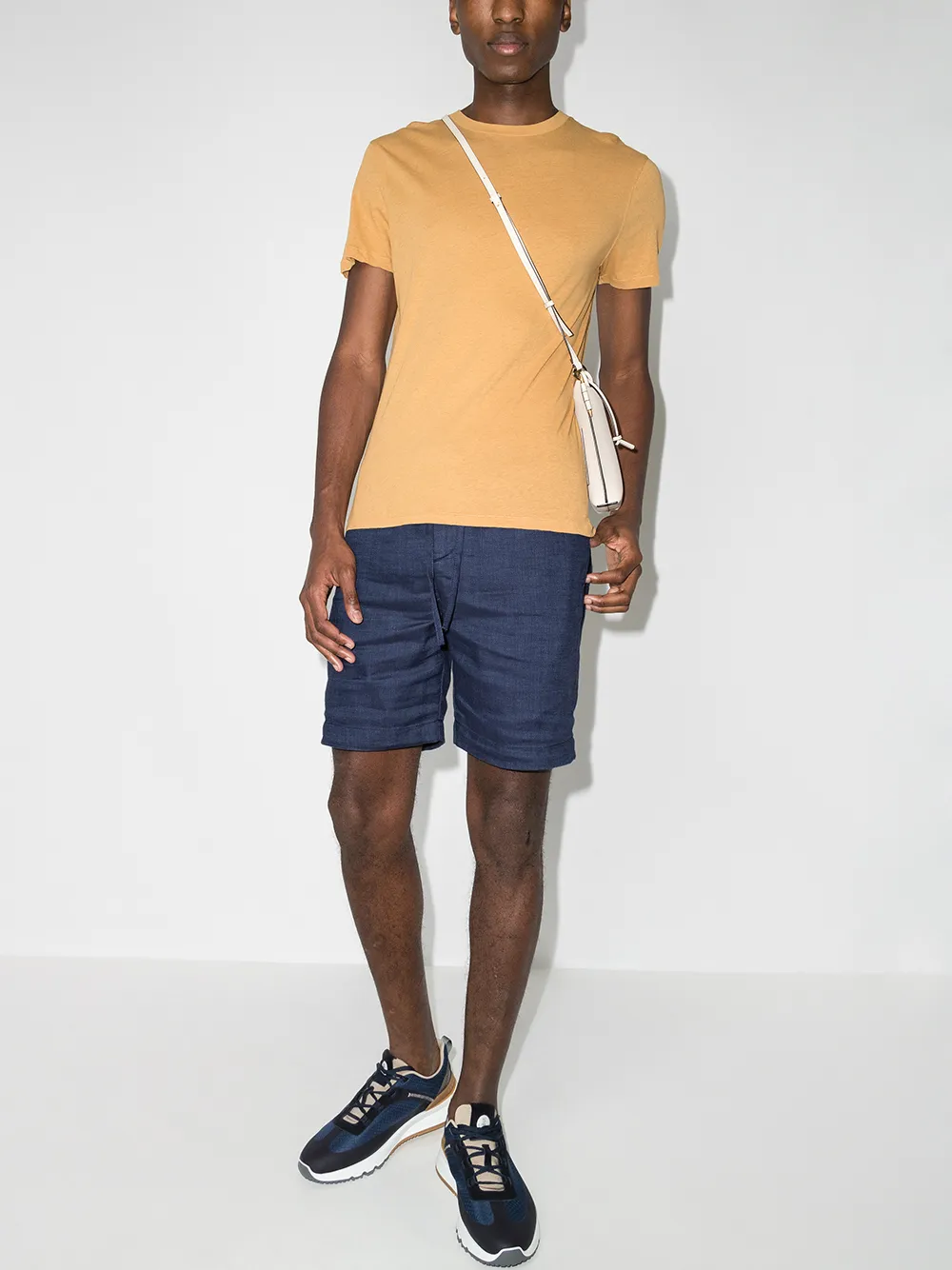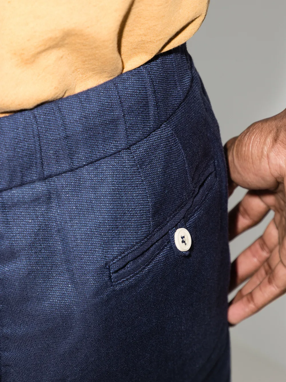 Эластичный пояс на шнурке, длина выше колена, два прорезных кармана по бокам и задние карманы с листочкой.