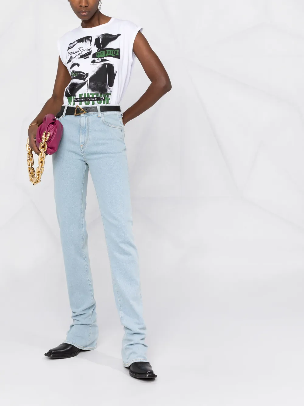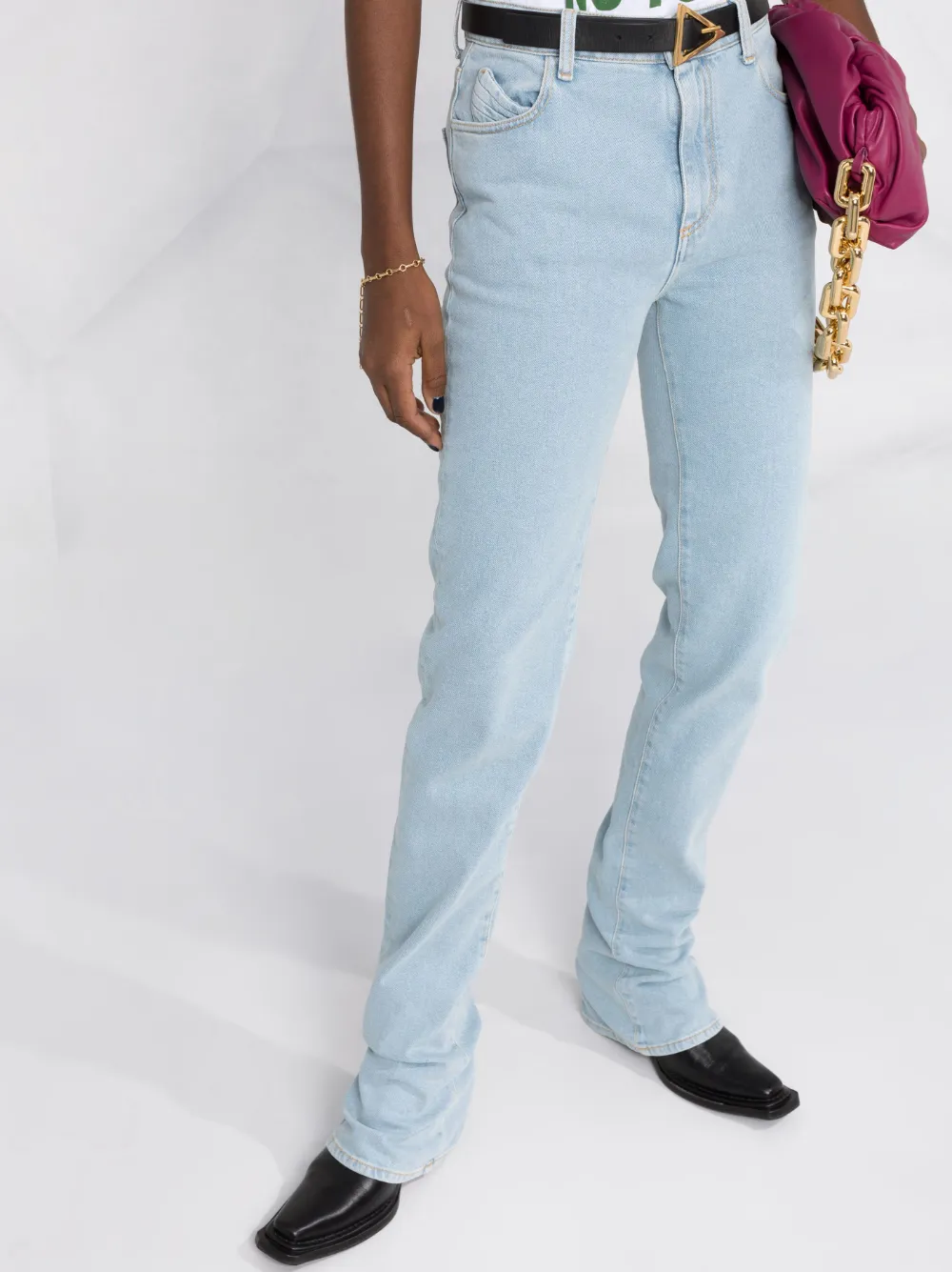Завышенная талия, расклешенный крой, петли для ремня, ширинка на пуговицах и классическая пятикарманная модель.