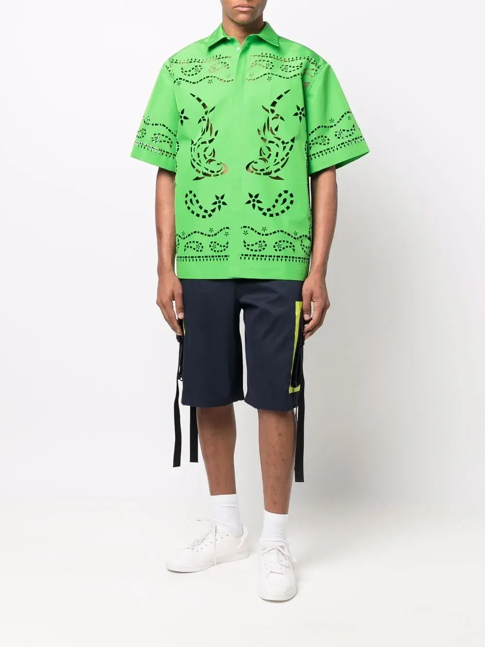Прямой крой, застежка на пуговицы, петли для ремня, накладные карманы сбоку и два кармана с листочкой сзади.