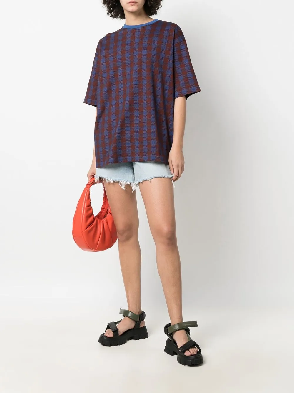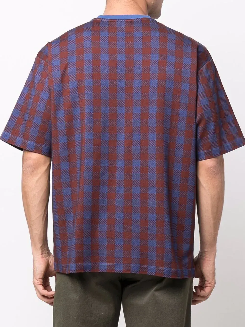 Принт в клетку, круглый вырез, приспущенные плечи, короткие рукава и прямой подол. Это унисекс-модель. Обратите внимание, что для нее используется мужская размерная сетка. Узнать больше о том, какие товары получают отметку «Ответственный выбор», можно из материала «Как мы оцениваем экологичность и этичность».