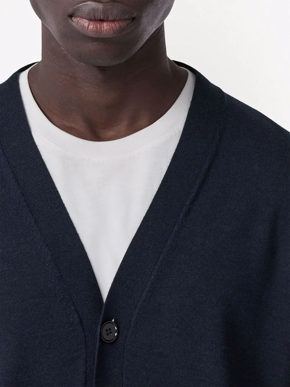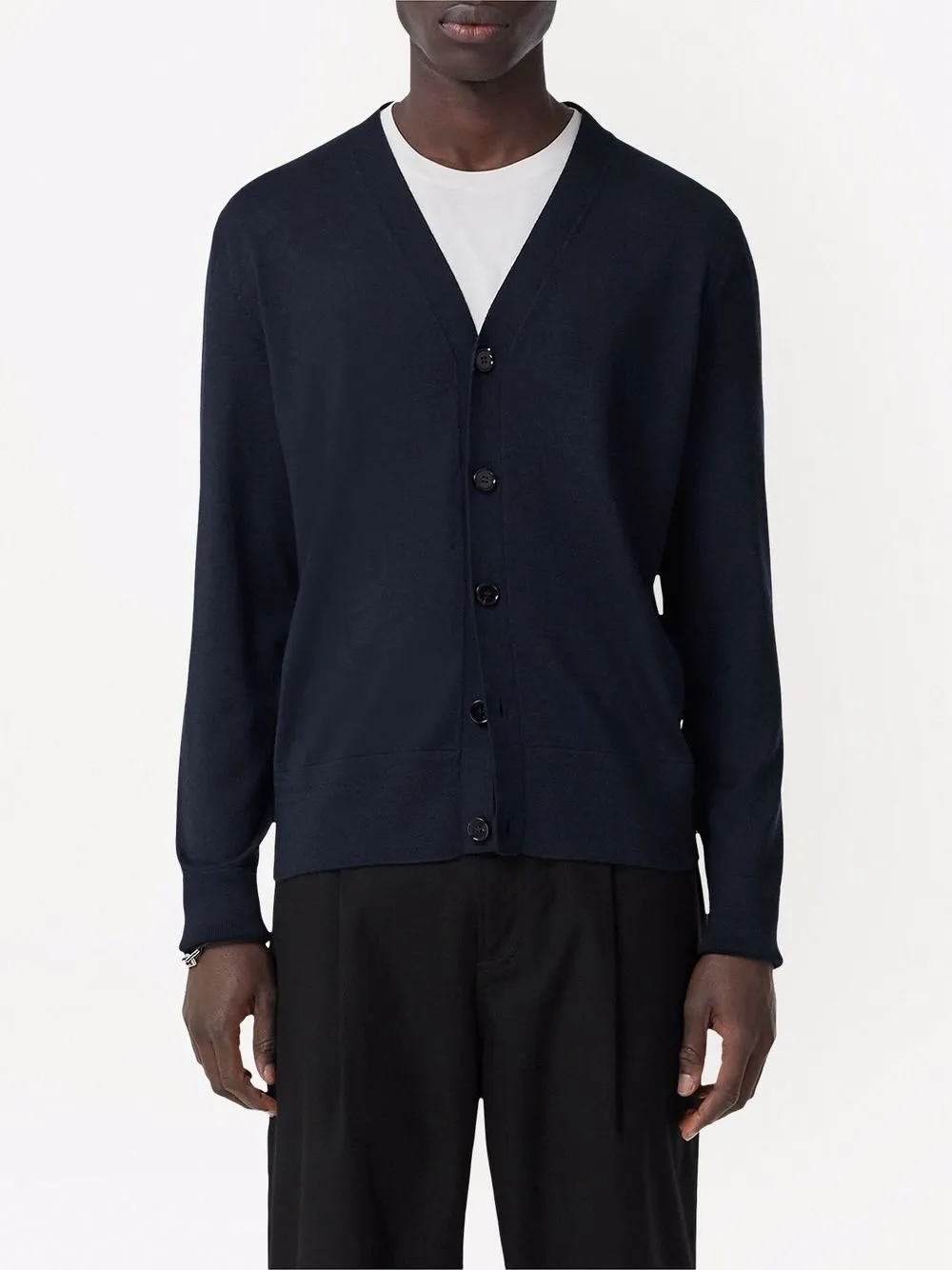 Декор в виде логотипа с монограммой TB, V-образный вырез, длинные рукава и застежка на пуговицах спереди.