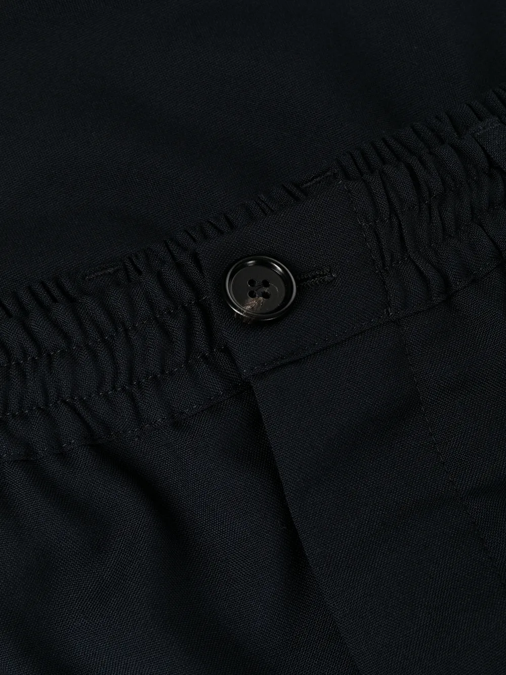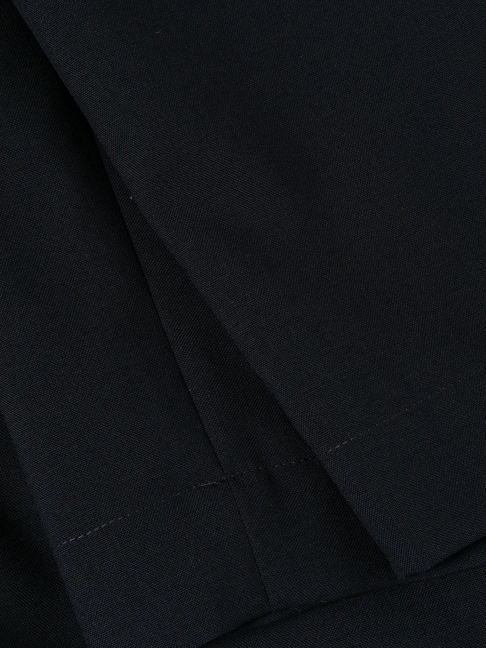 Зауженный крой, укороченная длина, средняя посадка, плиссировка, эластичный пояс, потайная застежка на молнии и пуговицах, петли для ремня, два кармана по бокам и два кармана на пуговице сзади.