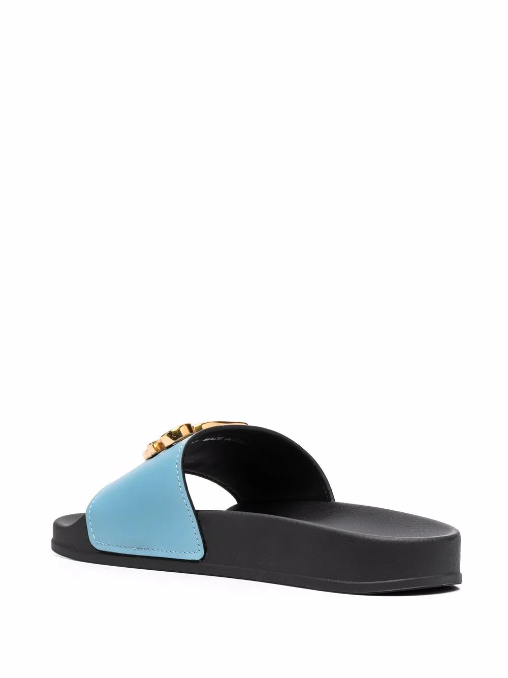Металлический логотип, золотистая фурнитура, открытый носок, модель без застежки и плоская подошва. Цвет: синий.