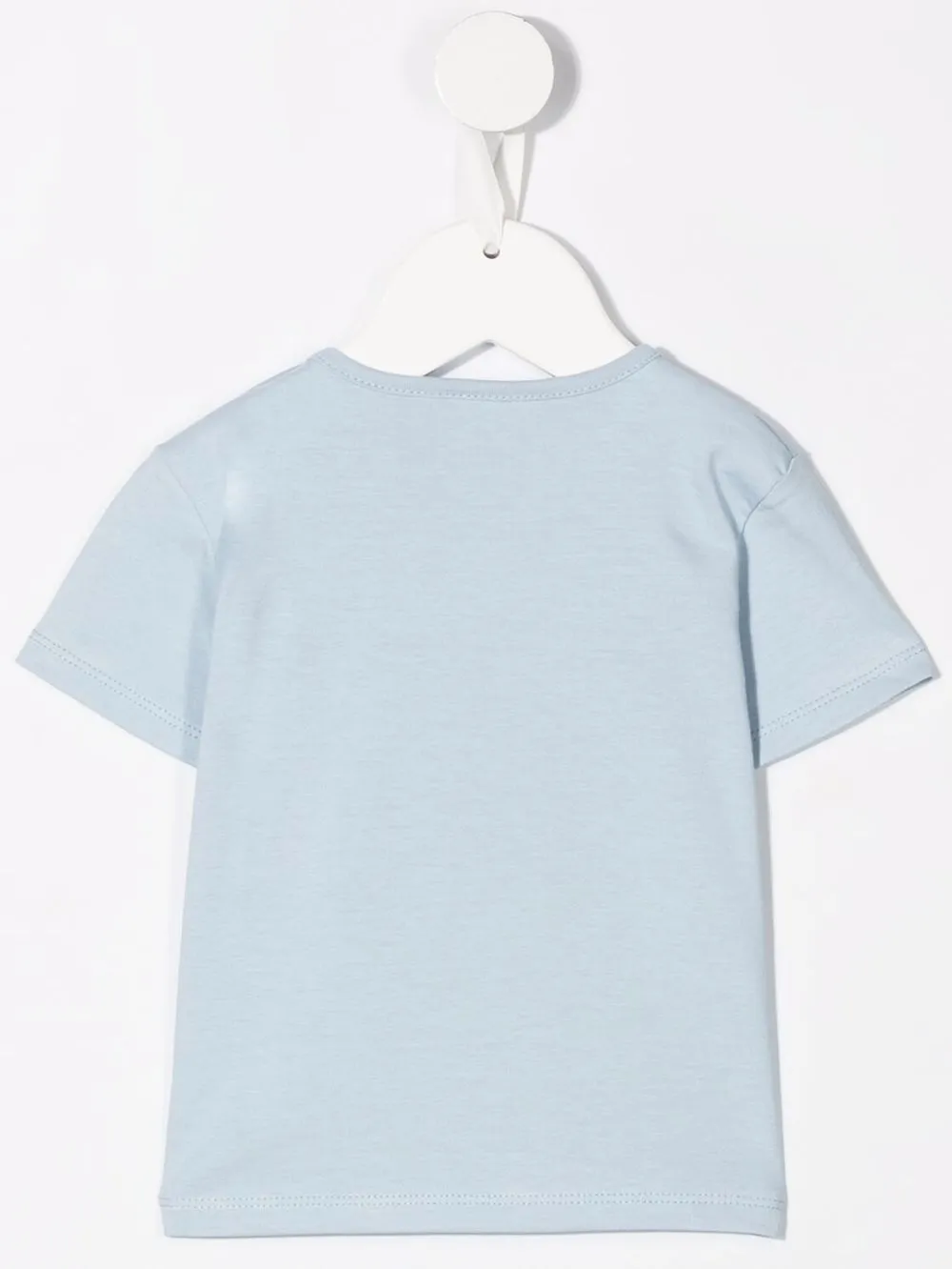 Графичный принт спереди, круглый вырез, пуговичные застежки на плечах и короткие рукава.