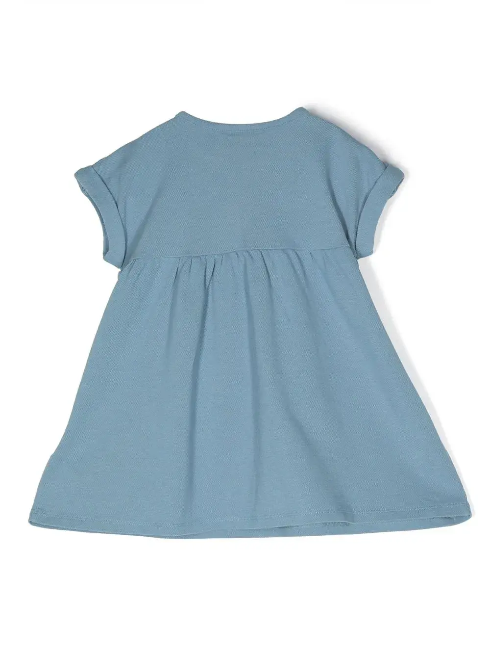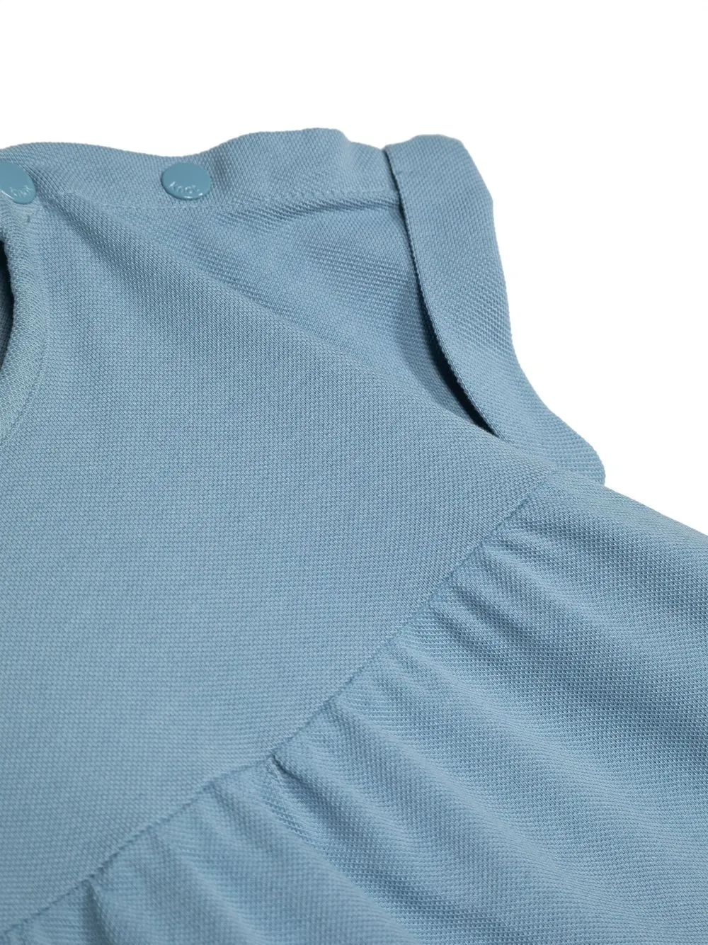 Синий, хлопок, застежка на кнопках на плече, круглый вырез и короткие рукава.