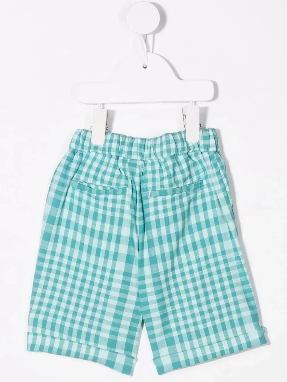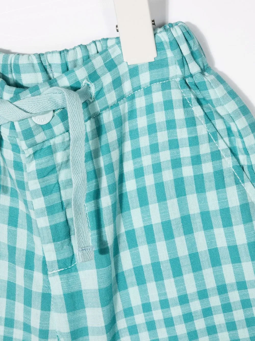 Принт в клетку, пояс на шнурке и два кармана с листочкой сзади. Цвет: синий.