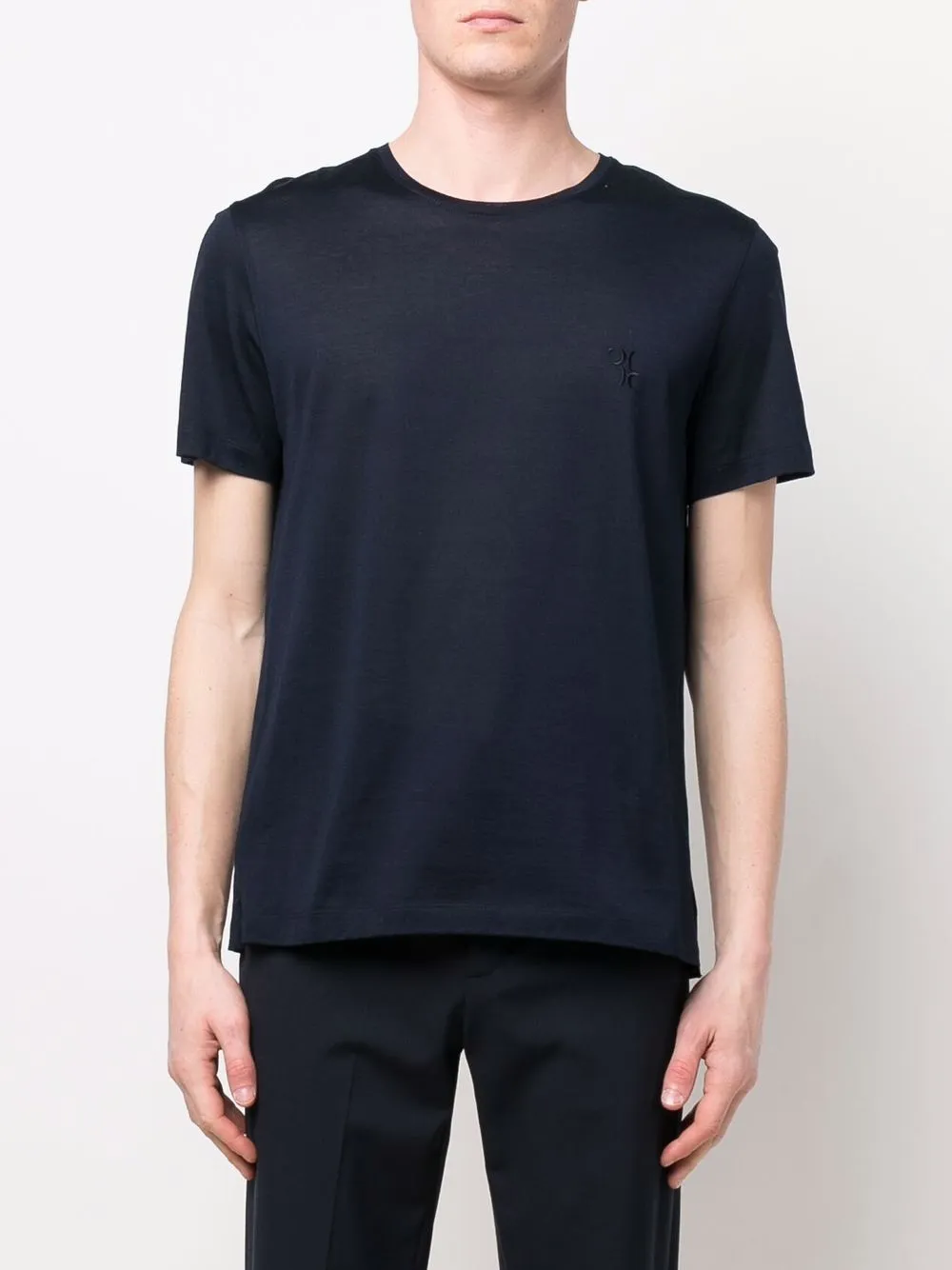 Вышитый логотип на груди, вышитый логотип сзади, круглый вырез, короткие рукава и прямой подол.