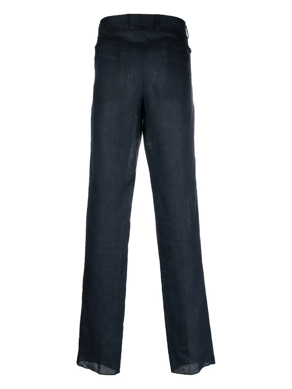 Темно-синий, лен, вышитый логотип сзади, петли для ремня, смещенная застежка на пуговицах спереди, застежка на молнии спереди, строгий крой, два прорезных кармана по бокам и два кармана с листочкой сзади.