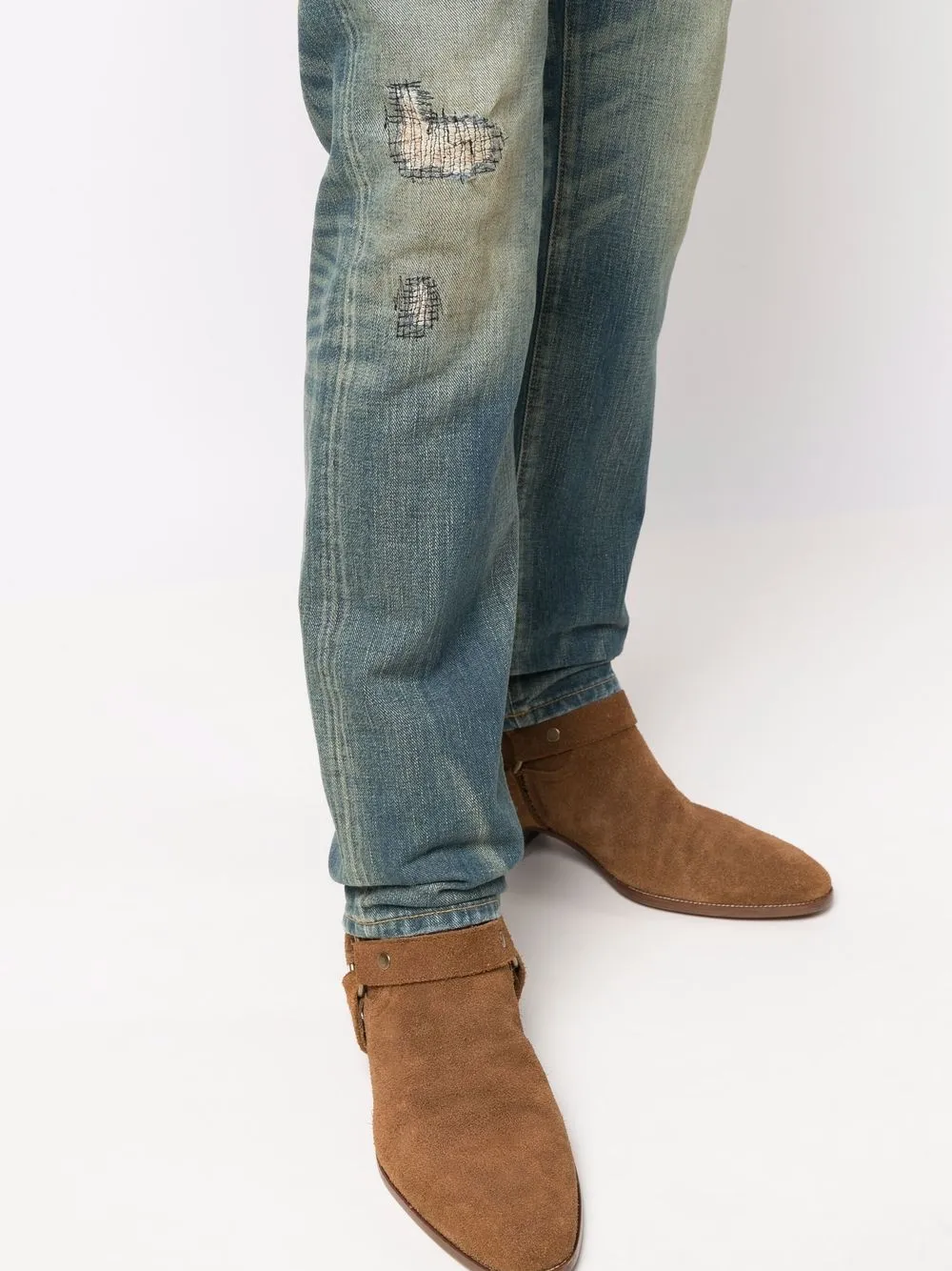 Эффект потертости, модель с прорезями, средняя посадка, петли для ремня, застежка на пуговицах спереди и классическая пятикарманная модель.