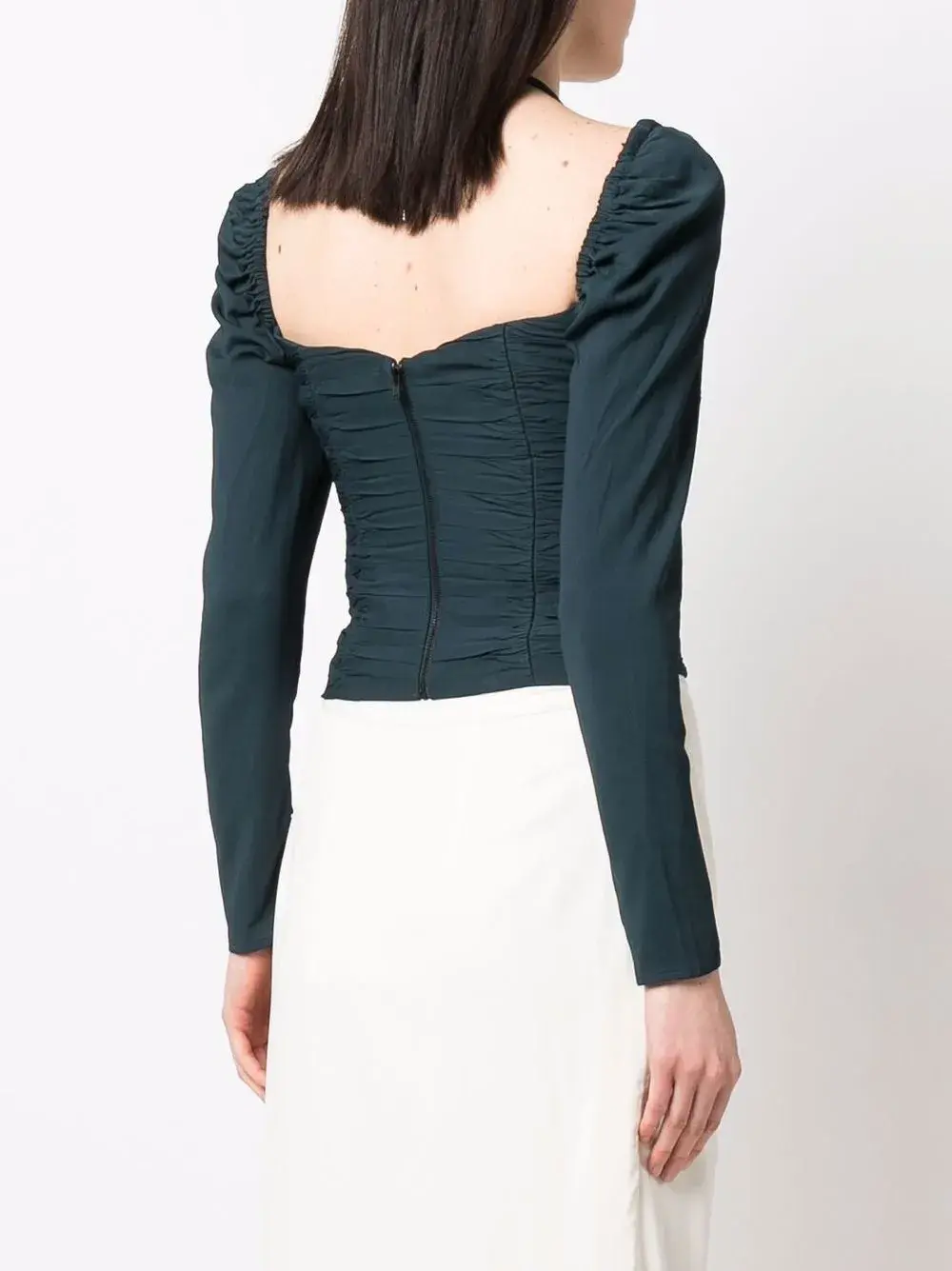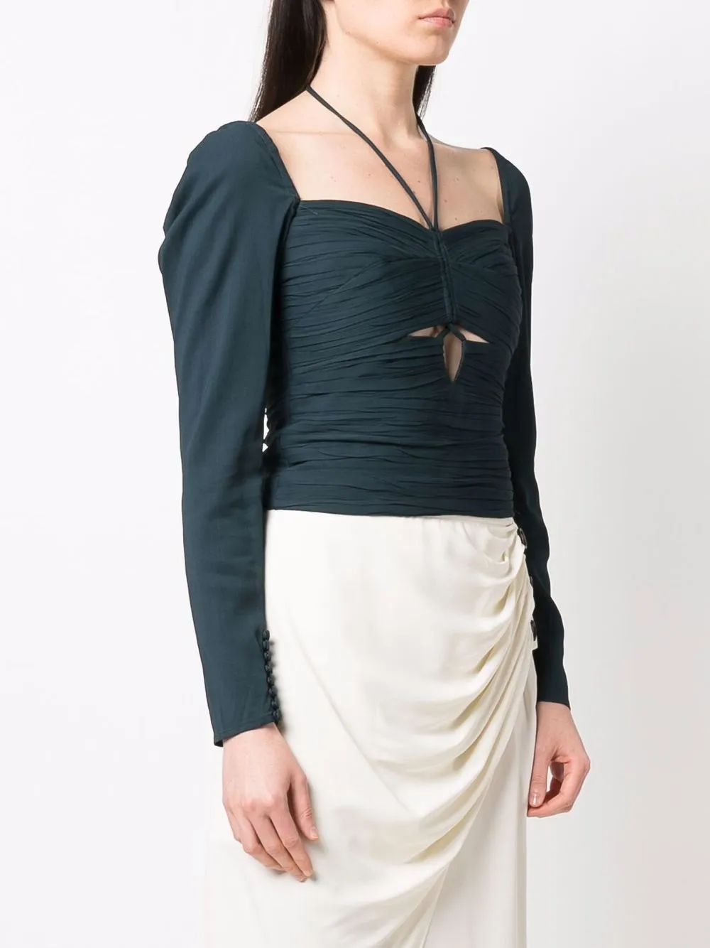 Плиссированная модель, завязки вокруг шеи, вырез в форме сердца, объемные рукава, потайная застежка на молнии сзади и вырезные детали.