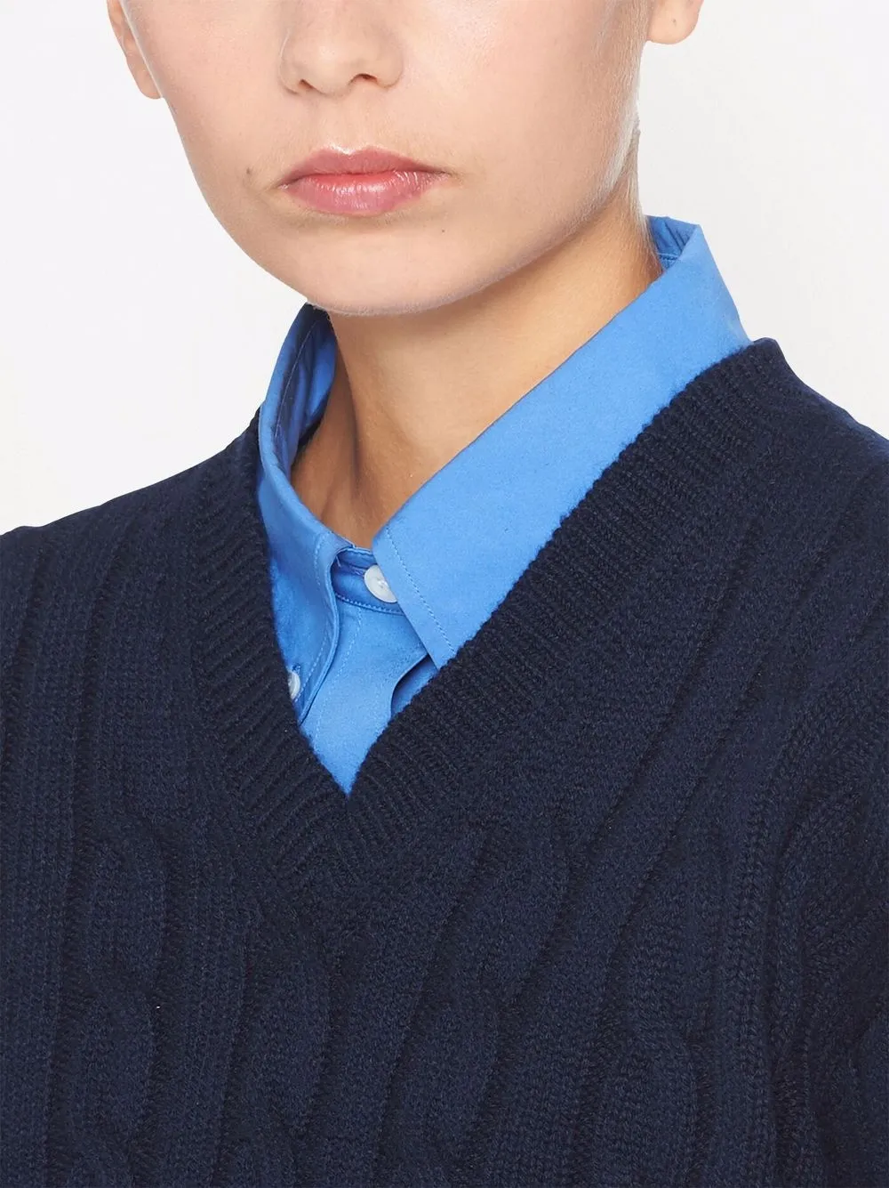 Фактурная вязка, V-образный вырез, длинные рукава и манжеты в рубчик.