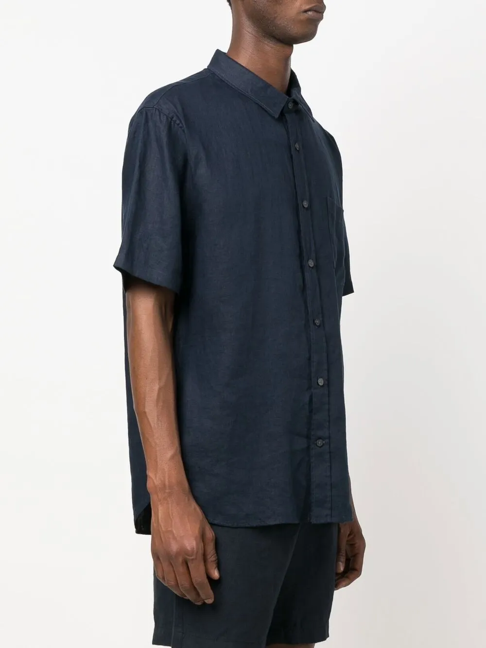 Темно-синий, лен, классический воротник, застежка на пуговицах спереди, короткие рукава, нагрудный накладной карман и прямой подол. .