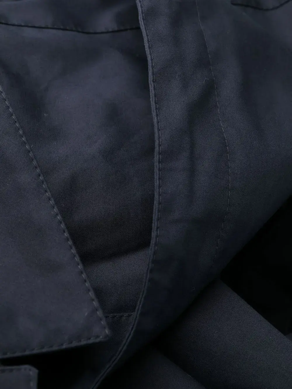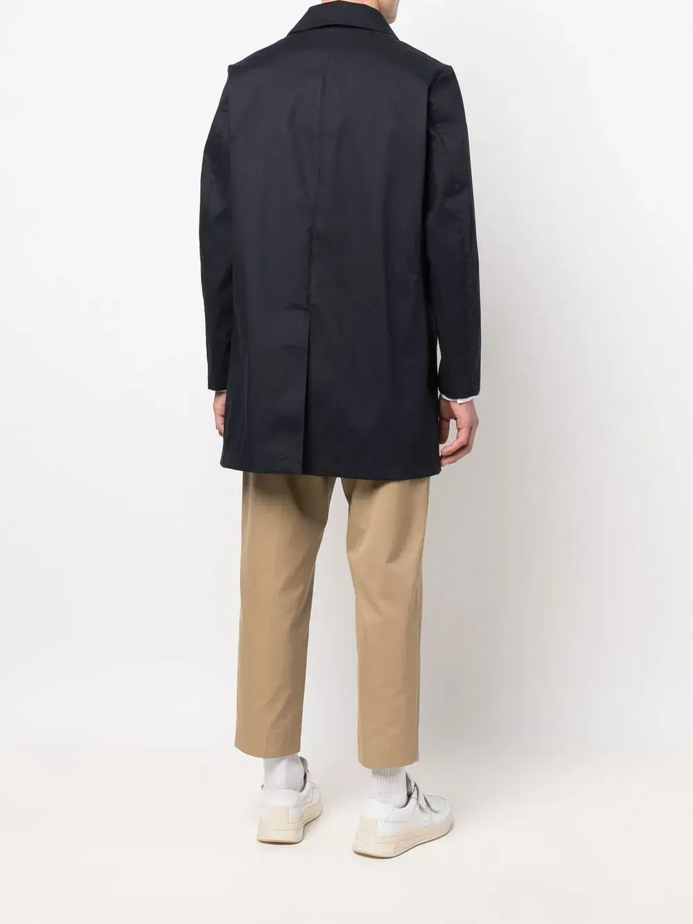 Темно-синий, затягивающийся на шнурок капюшон, классический воротник, потайная застежка спереди, два кармана по бокам, длинные рукава и прямой подол.