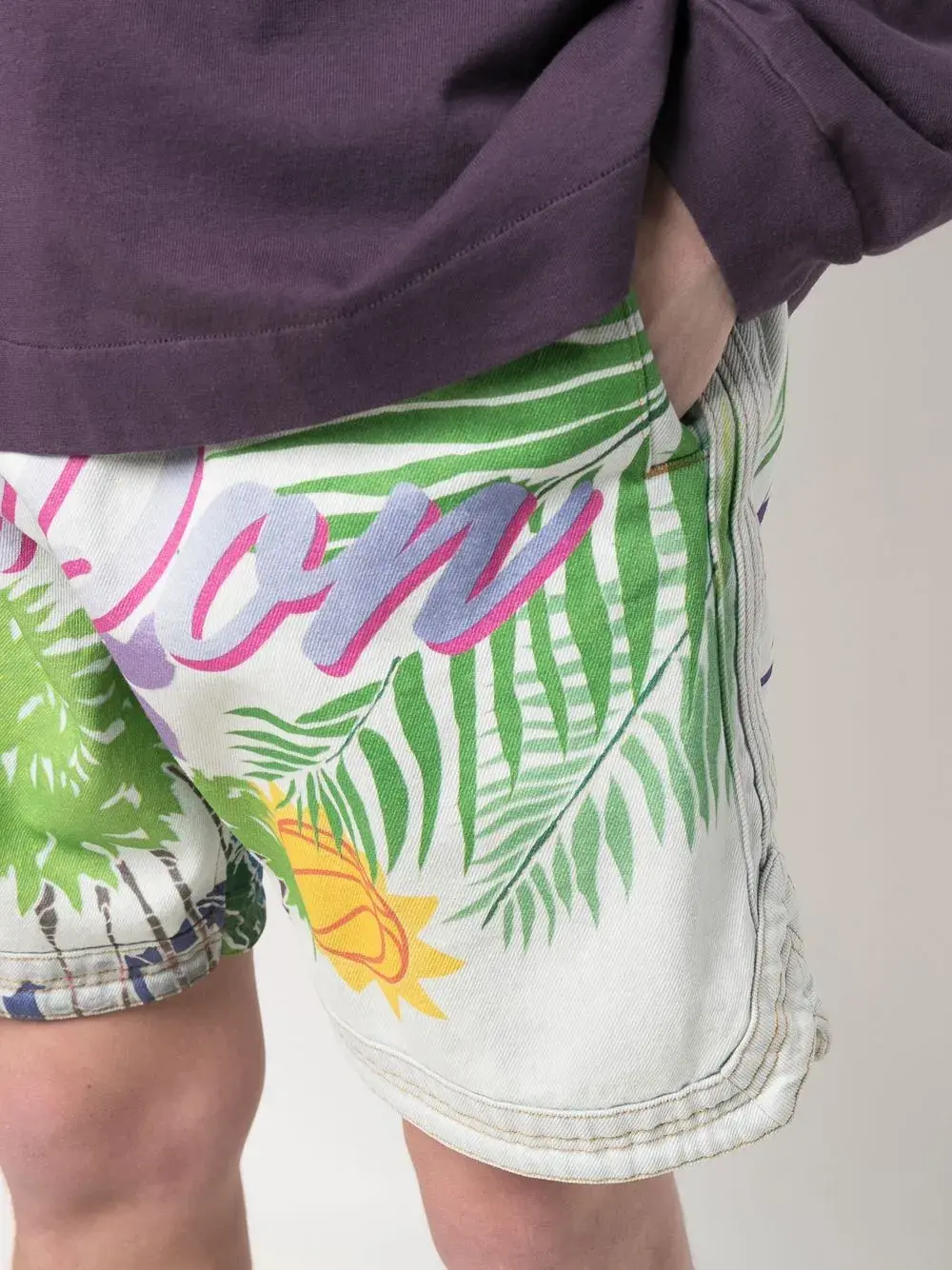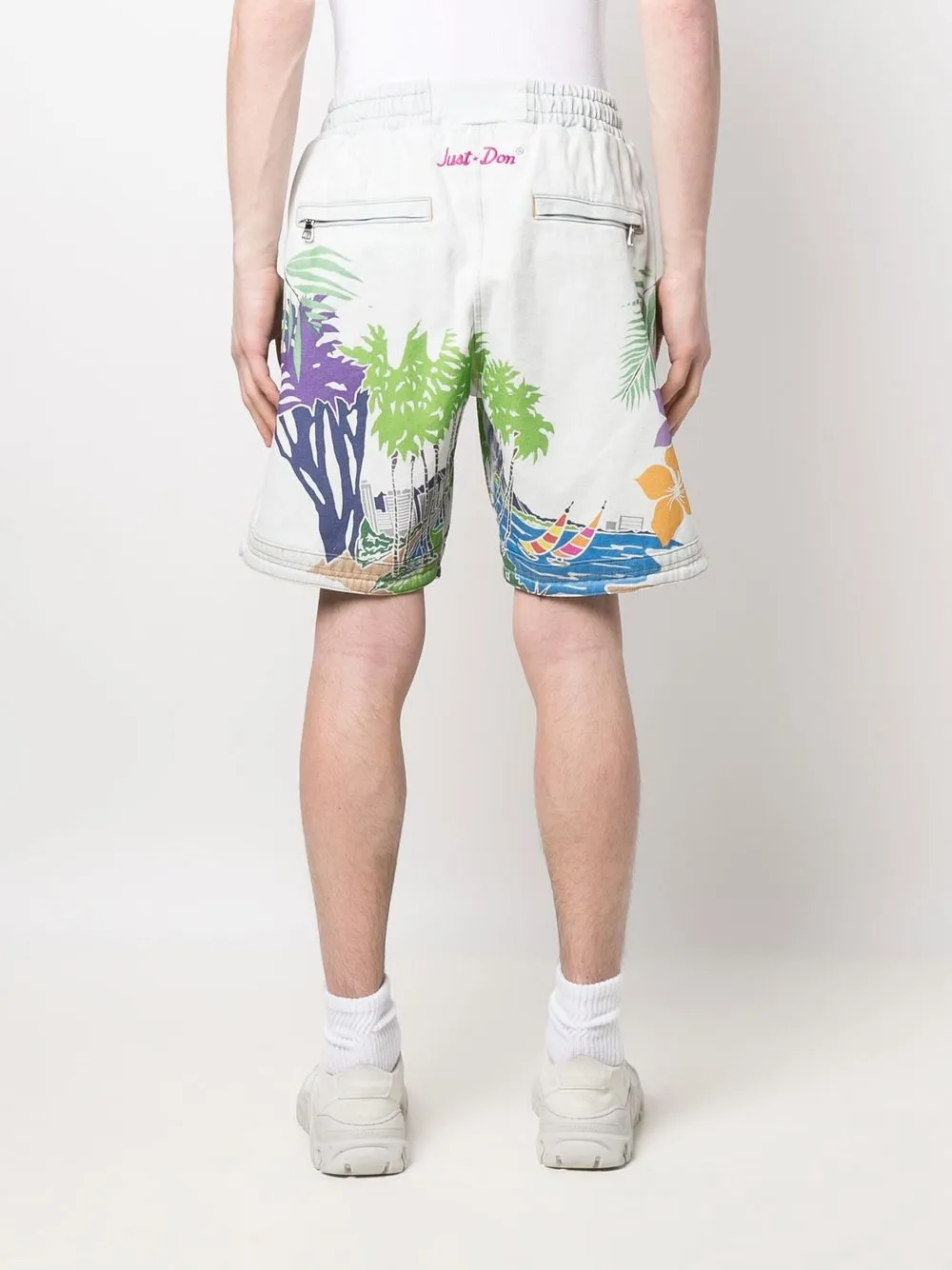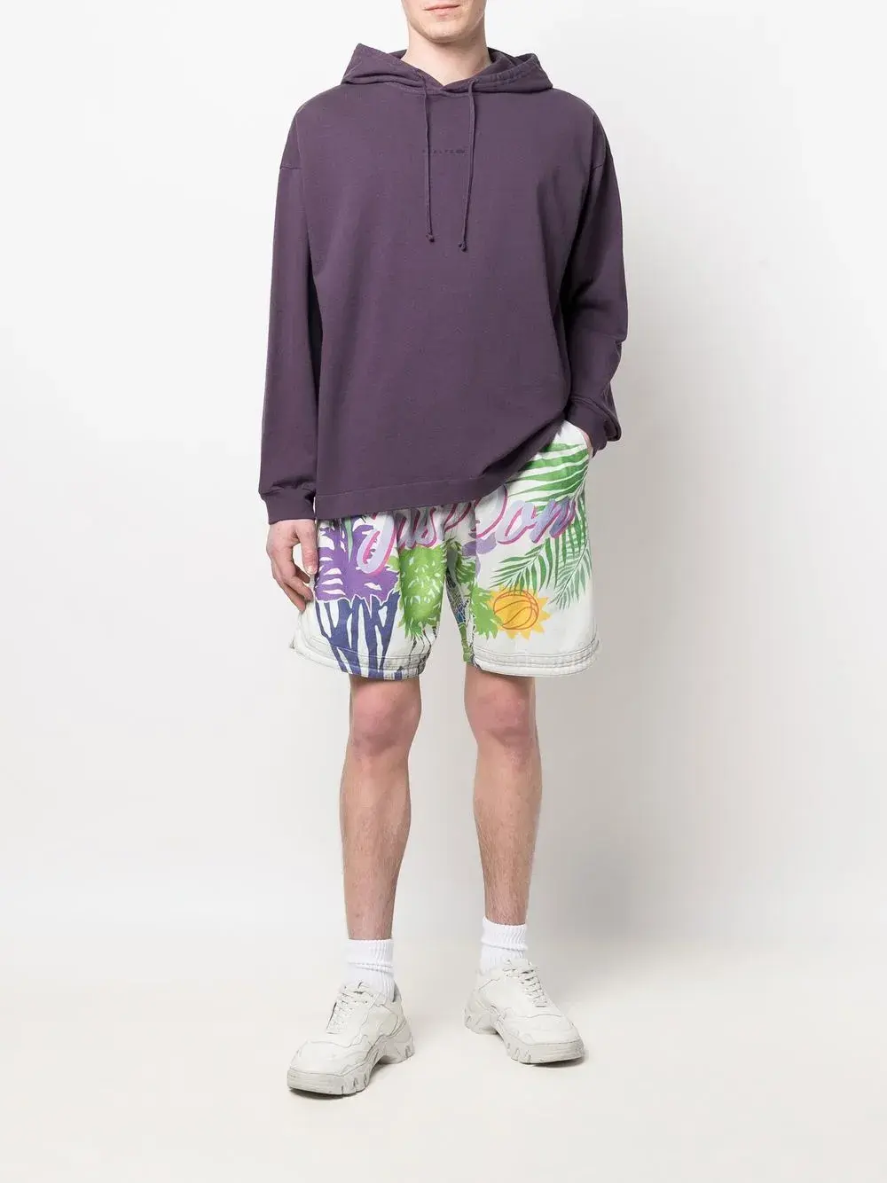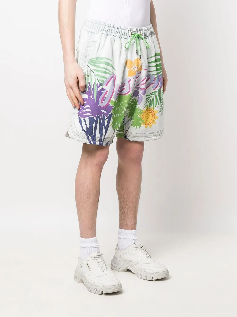 Сплошной графичный принт, логотип спереди, эластичный пояс на шнурке, прорезные карманы по бокам, длина выше колена и прямой подол. Цвет: разноцветный.