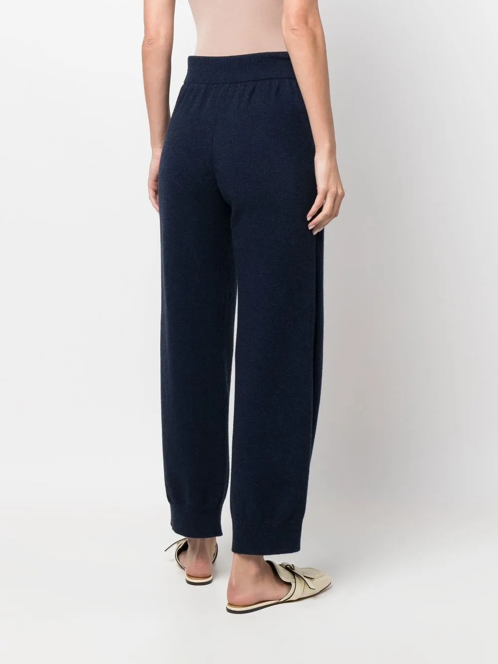 Темно-синий, кашемир, свободный крой, завышенная талия и эластичный пояс.