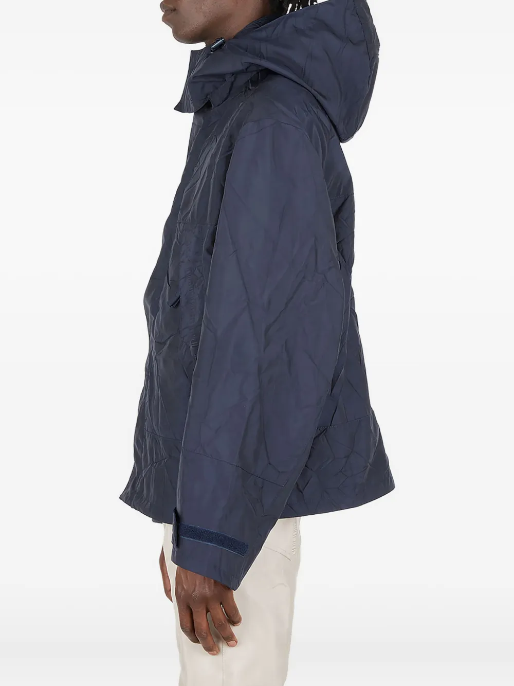 Темно-синяя стеганая фактура, капюшон, вырез горловины, карманы с клапанами, регулируемые манжеты, потайная застежка-молния