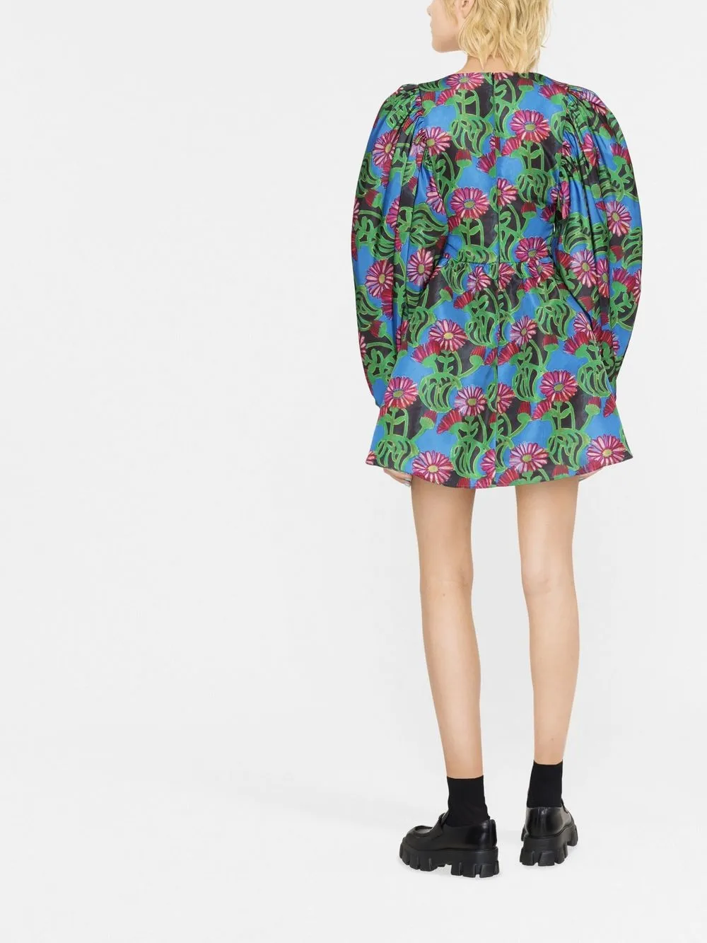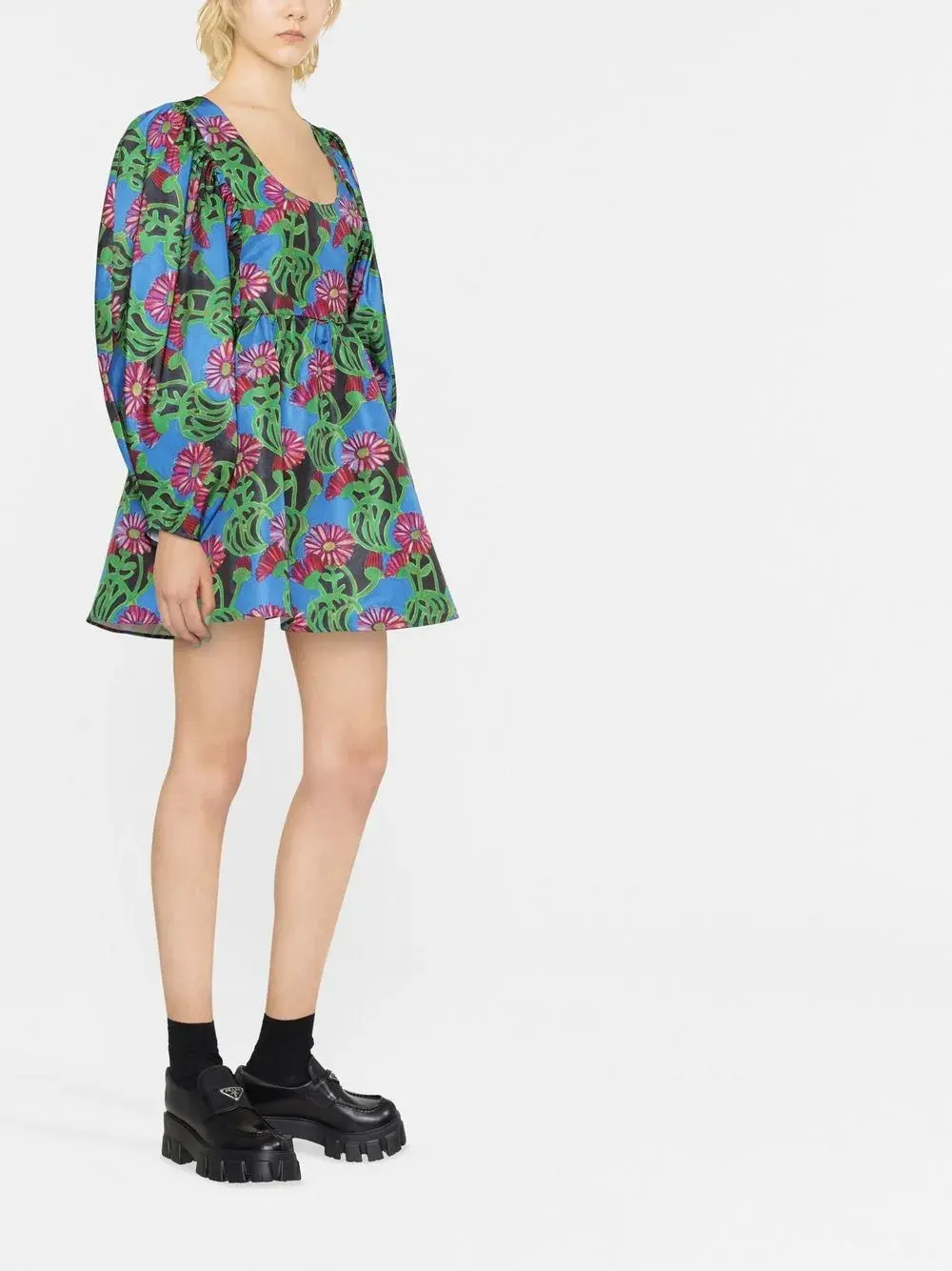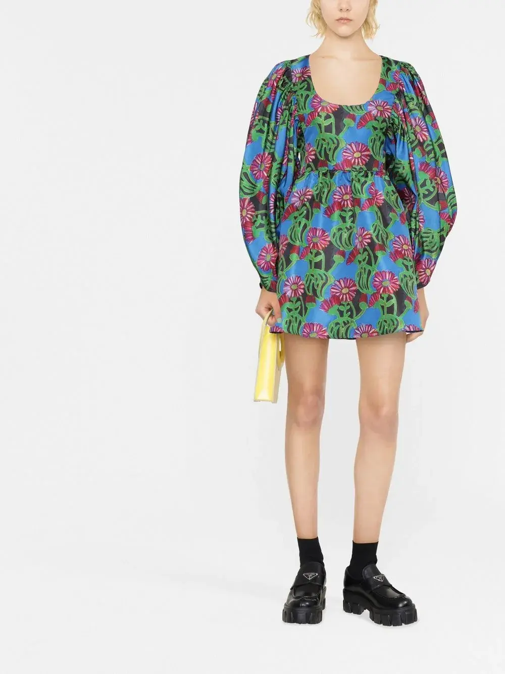 Разноцветный, сплошной цветочный принт, объемные рукава, U-образный вырез, расклешенная юбка и застежка на молнии сзади.