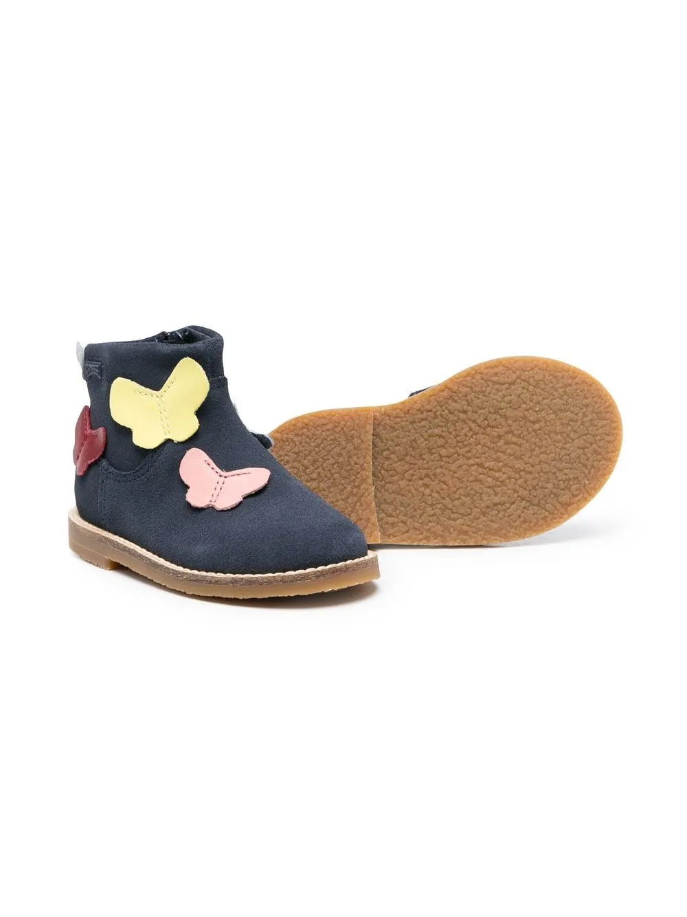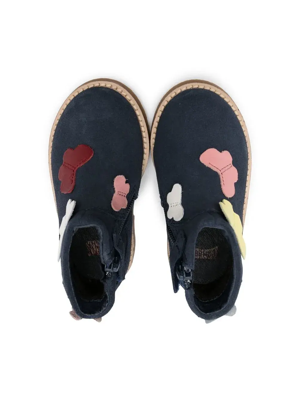 Темно-синий, телячья кожа, отделка из замши, аппликация, застежки на молнии сбоку, стелька с логотипом, закругленный носок, плоская резиновая подошва и высота по щиколотку.