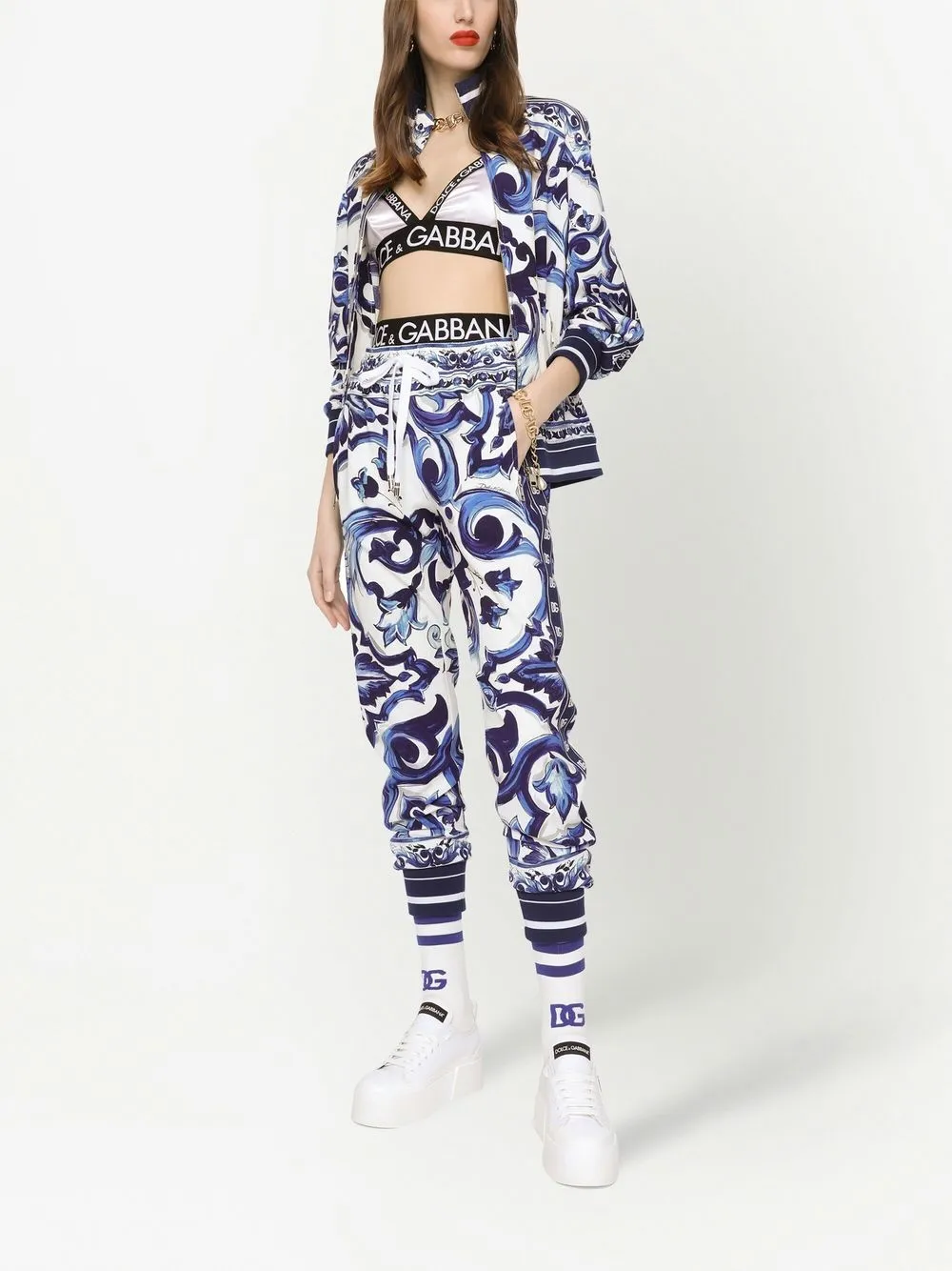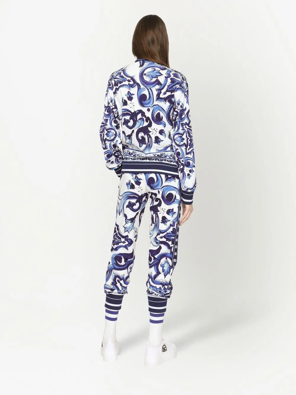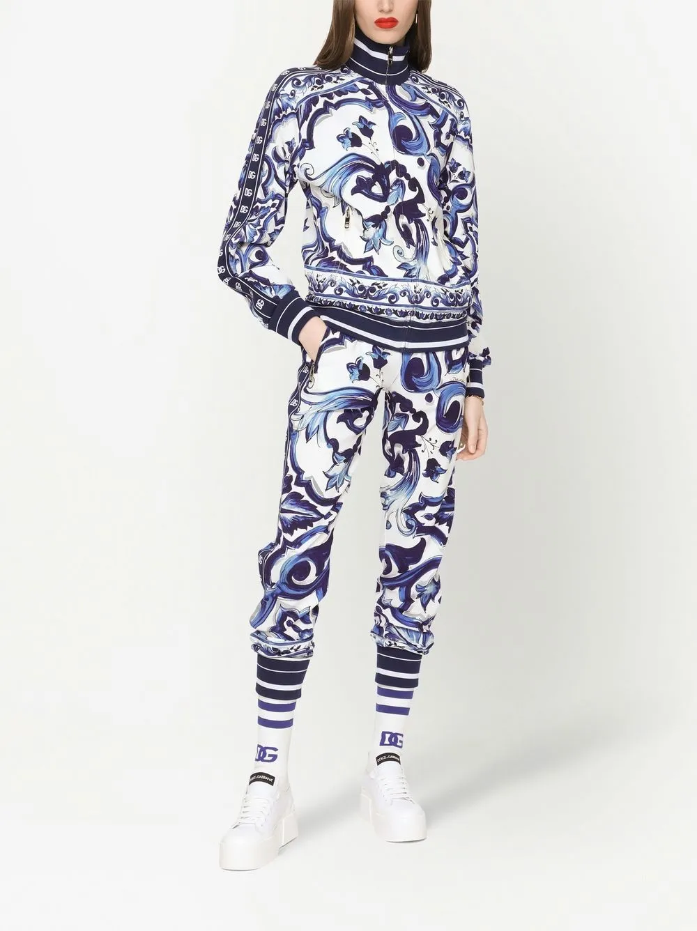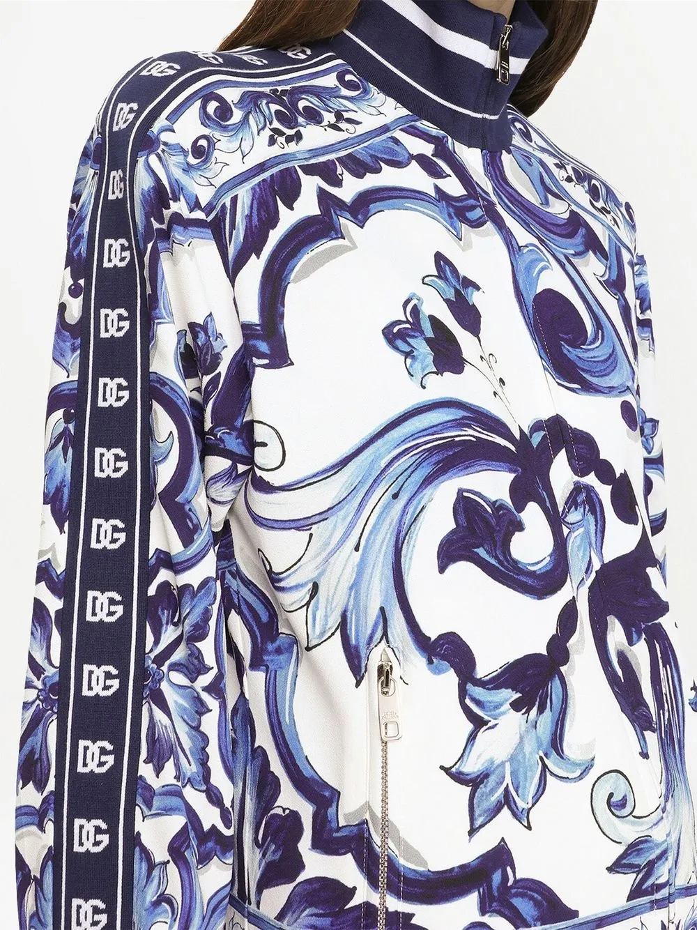 Темно-синий, белый, принт Majolica, отделка лентой с логотипом, высокий воротник, застежка на молнии спереди, длинные рукава, два кармана на молнии по бокам, эластичные манжеты и эластичный подол.
