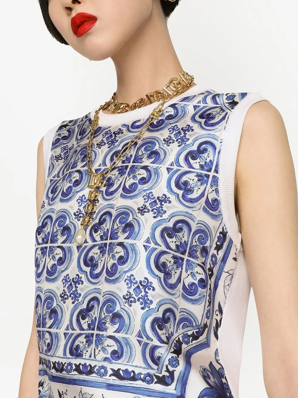 Белый, темно-синий, шелк, принт Majolica, круглый вырез, без рукавов и края в рубчик.