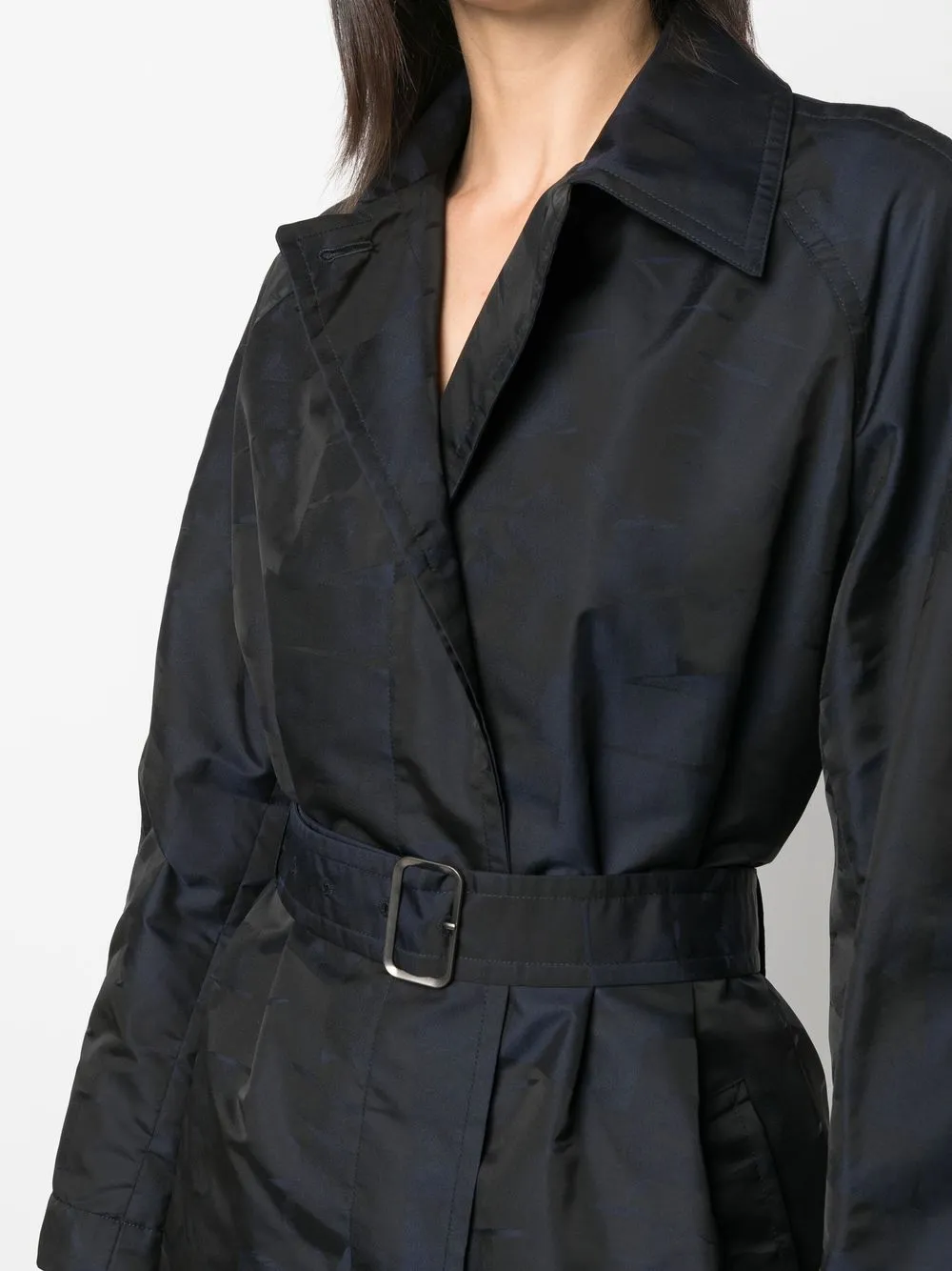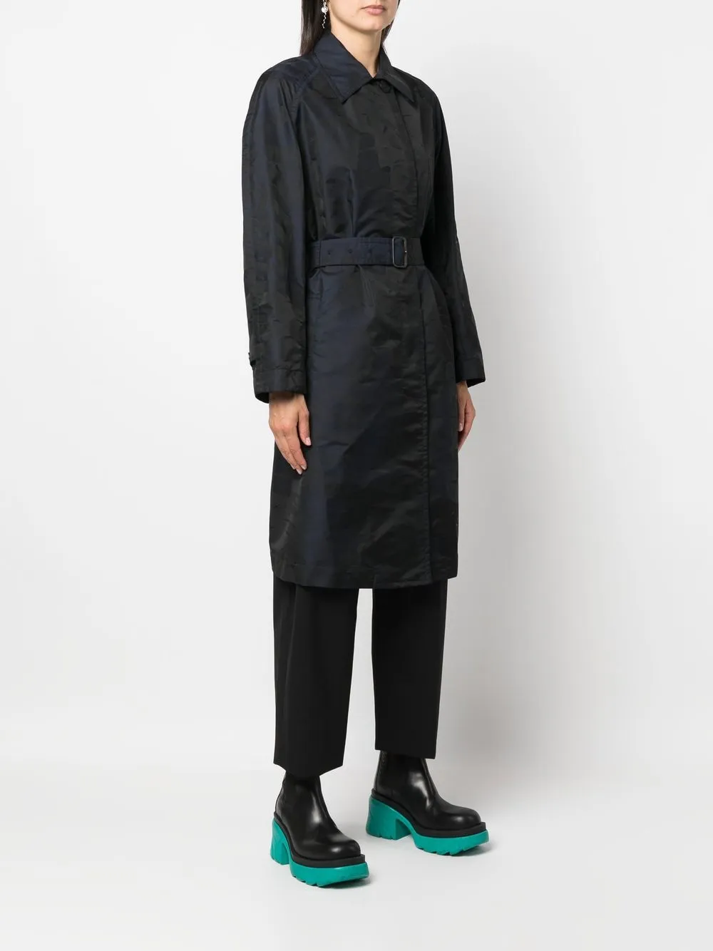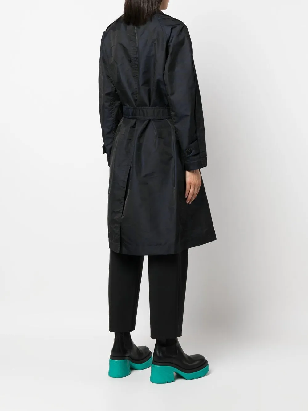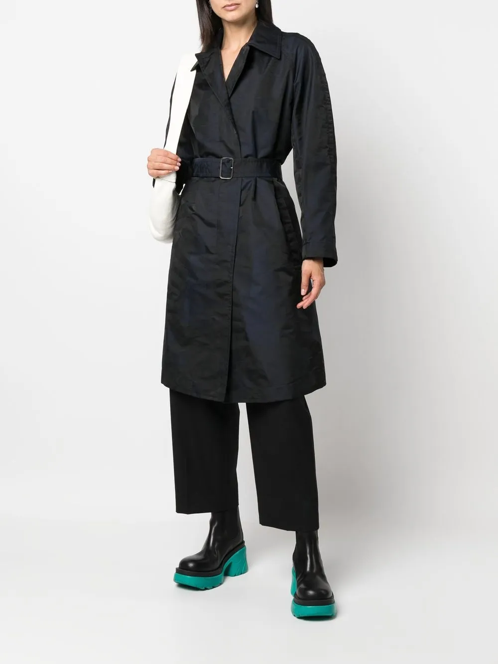 Синий, ремень на талии, зазубренные лацканы и длина миди.