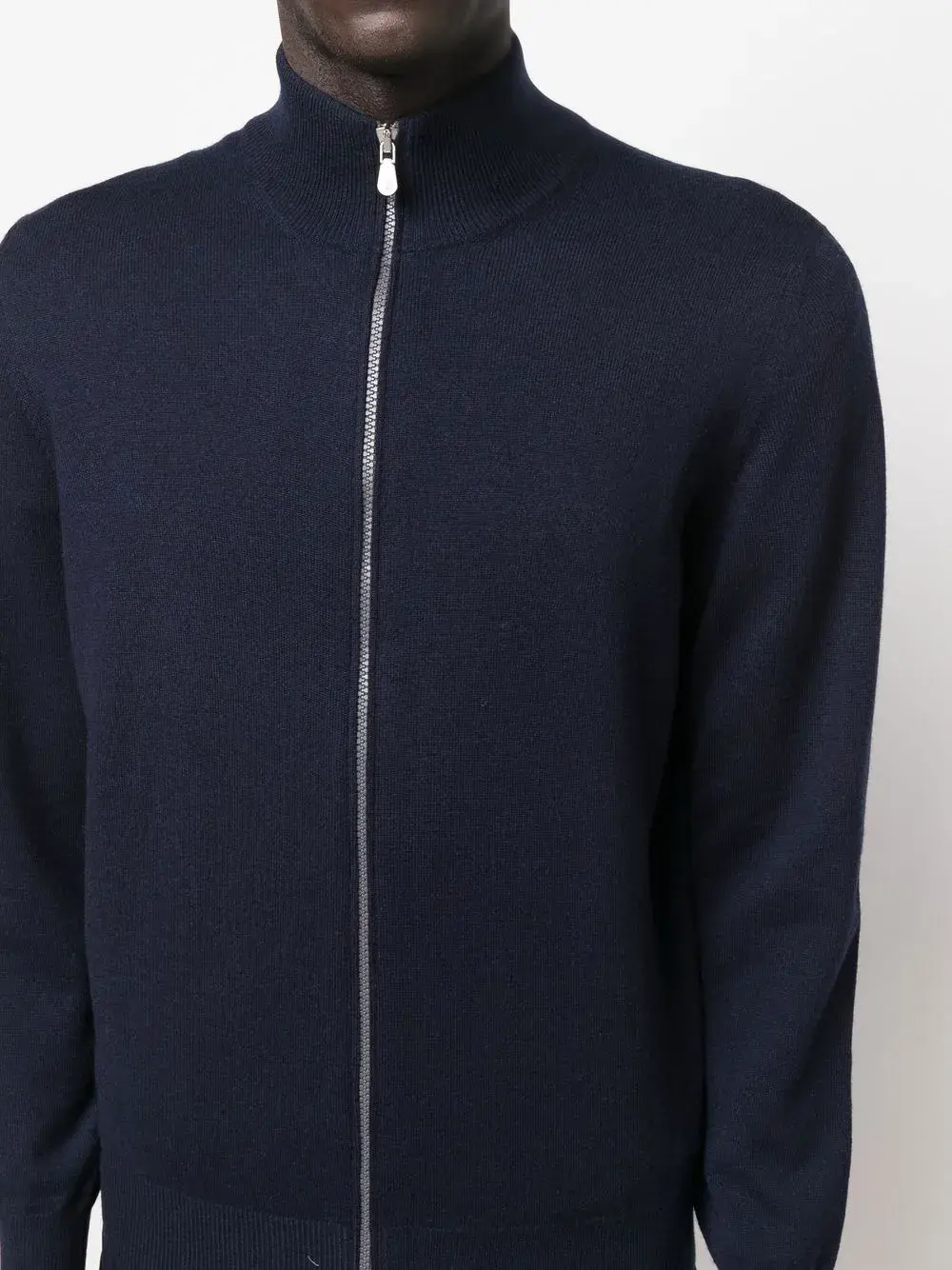 Темно-синий, кашемир, тонкая вязка, воротник-труба, застежка на молнии спереди и длинные рукава.