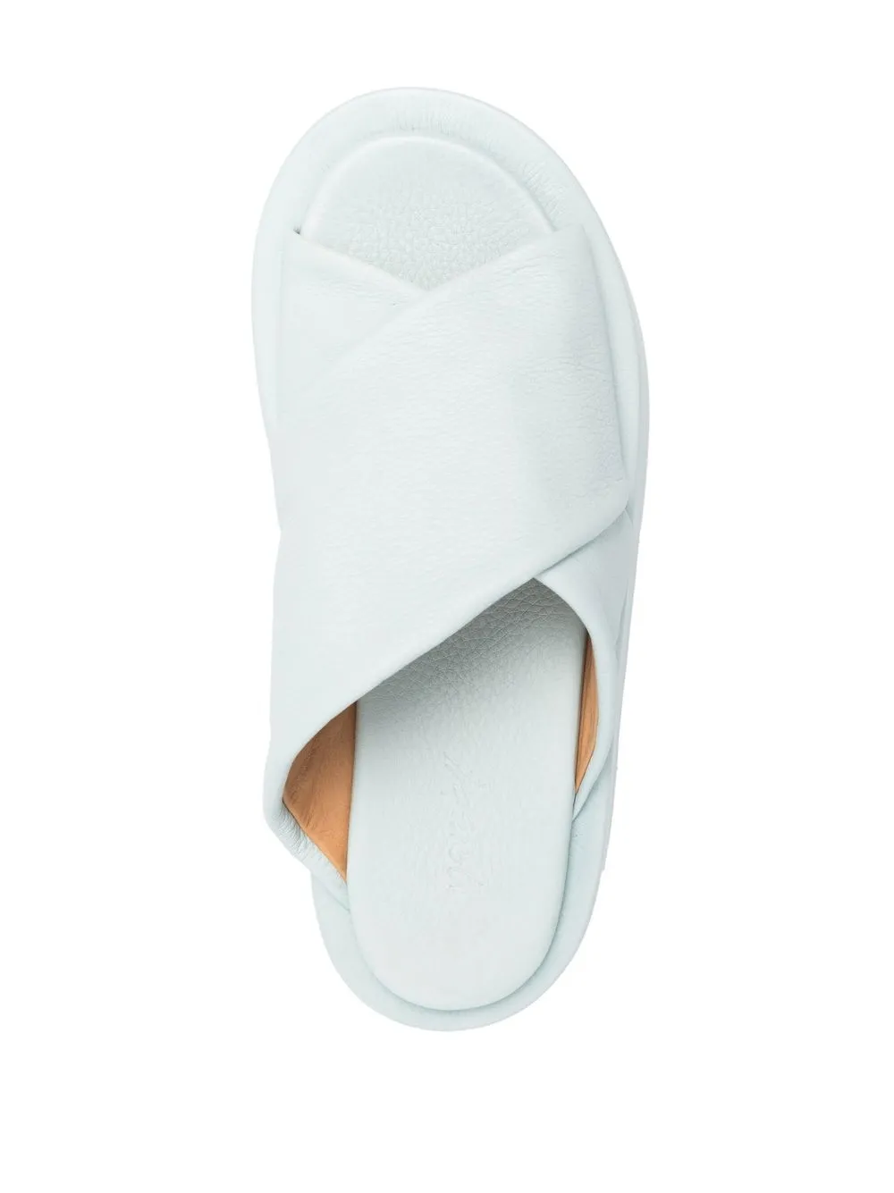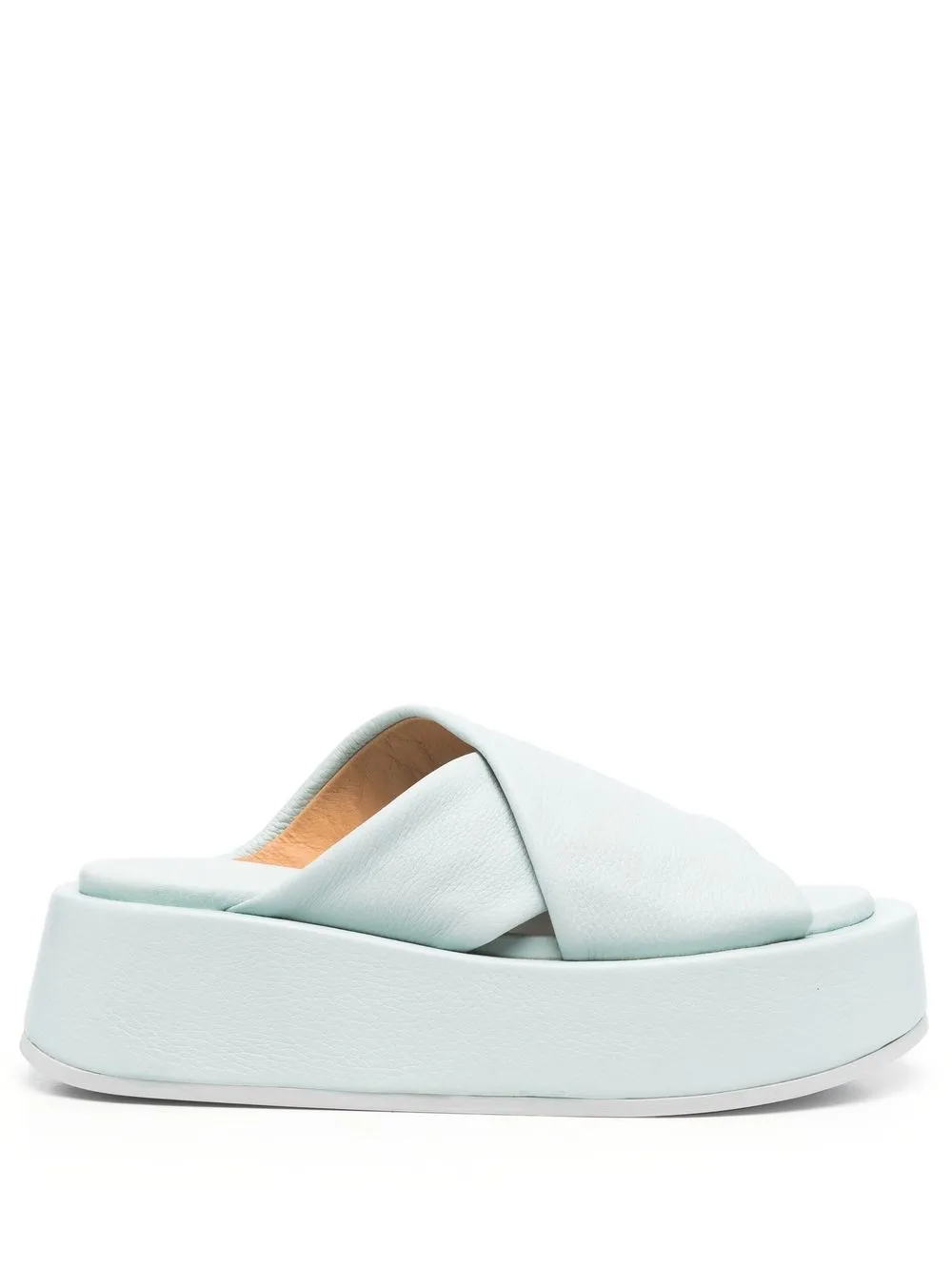 Голубой, кожа, открытый носок, перекрестные ремешки и массивная резиновая подошва.