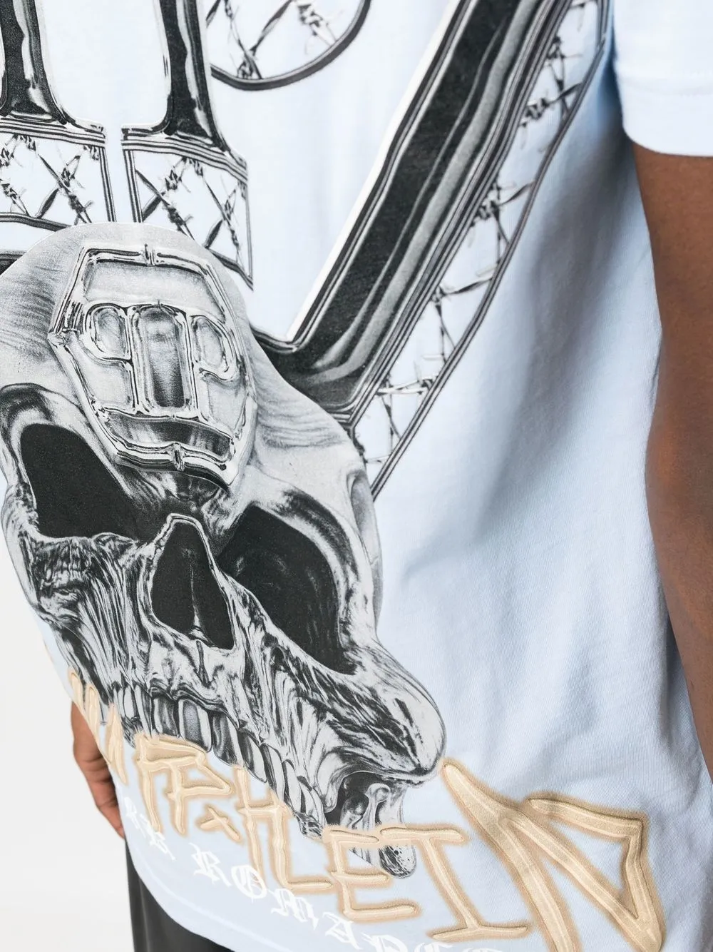 Голубой, хлопок, принт с логотипом на груди, принт с изображением черепа на тыльной стороне, круглый вырез, короткие рукава и прямой подол.