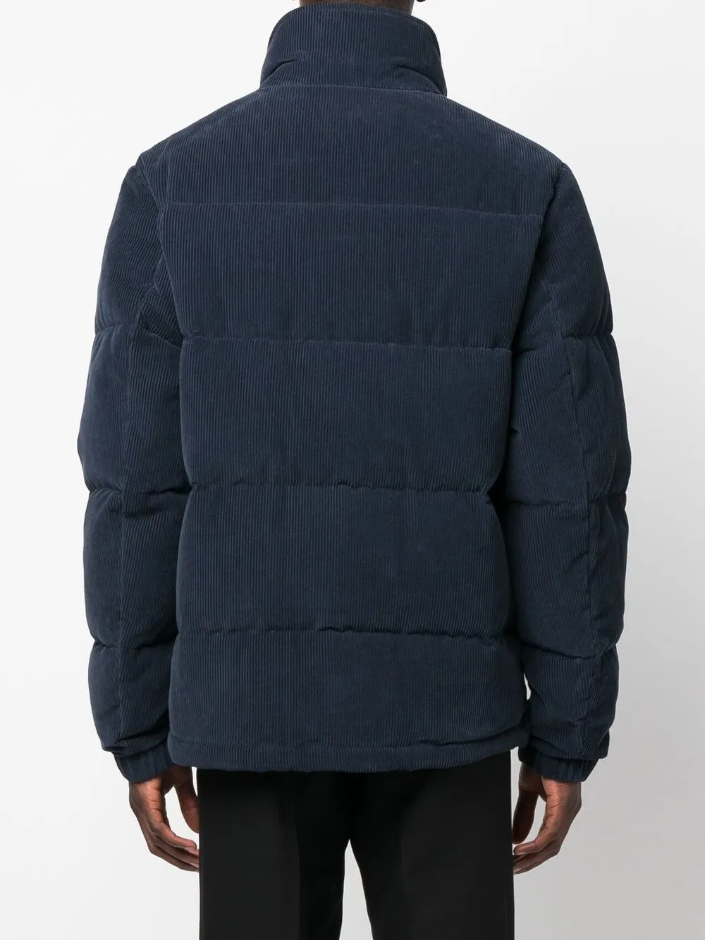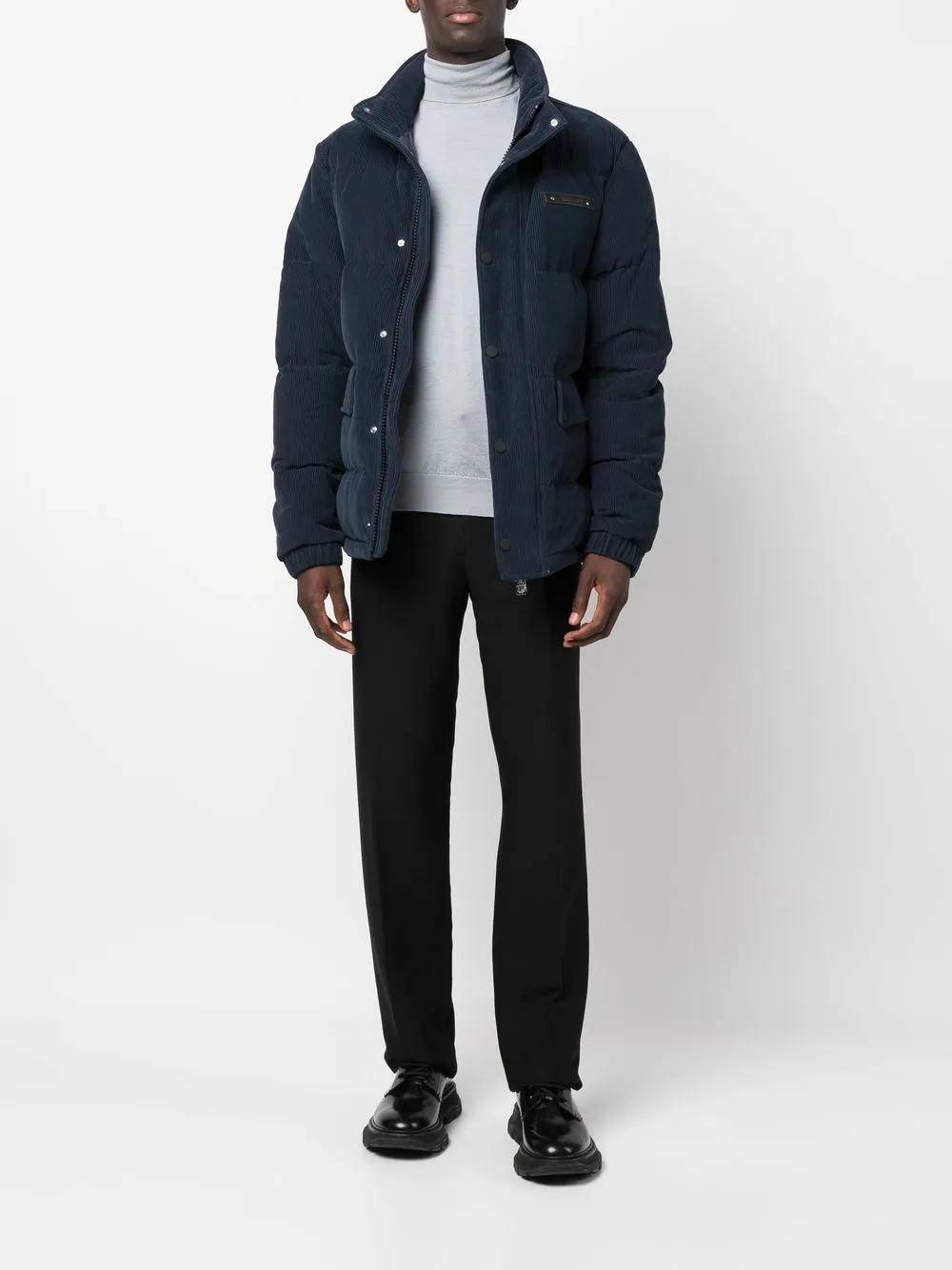 Темно-синий, гусиный пух, хлопок, вельветовый материал, высокий воротник, потайная застежка спереди, длинные рукава, два передних кармана с клапанами и прямой подол.