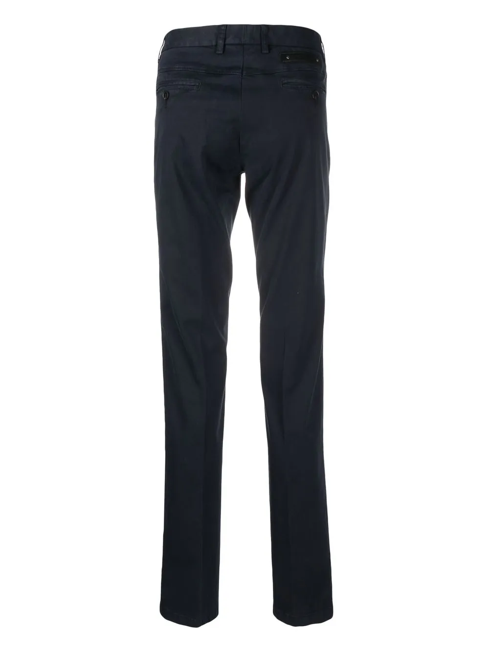 Темно-синий, эластичный хлопок, петли для ремня, ширинка на пуговицах, пять карманов и прямой крой.
