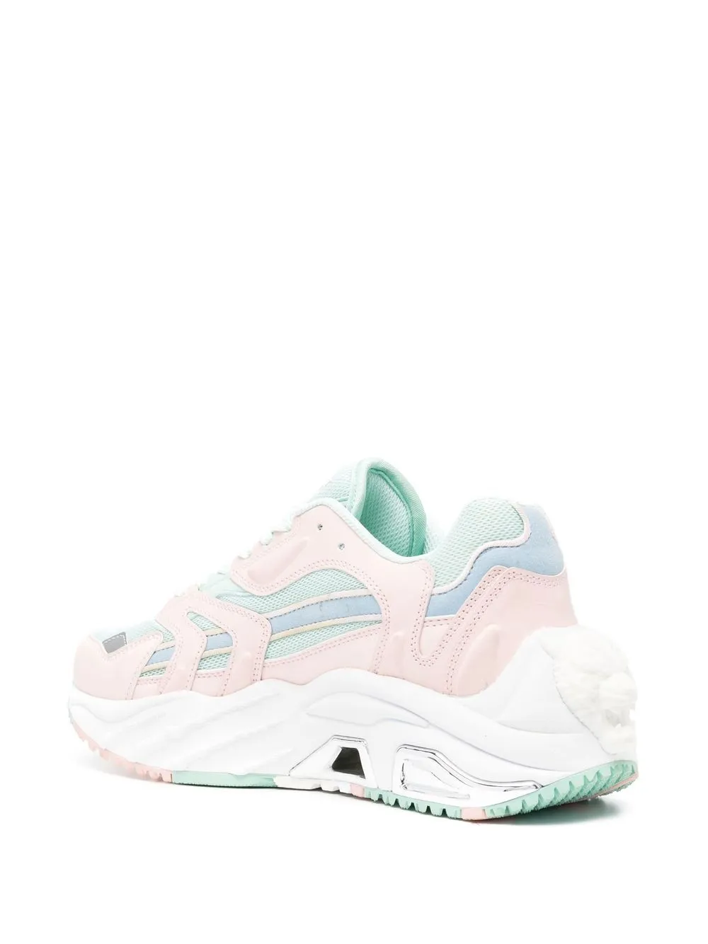 Светло-розовый, голубой, вставки, язычок с логотипом, шнуровка спереди, закругленный носок и массивная резиновая подошва. Это унисекс-модель. Обратите внимание, что для нее используется мужская размерная сетка.