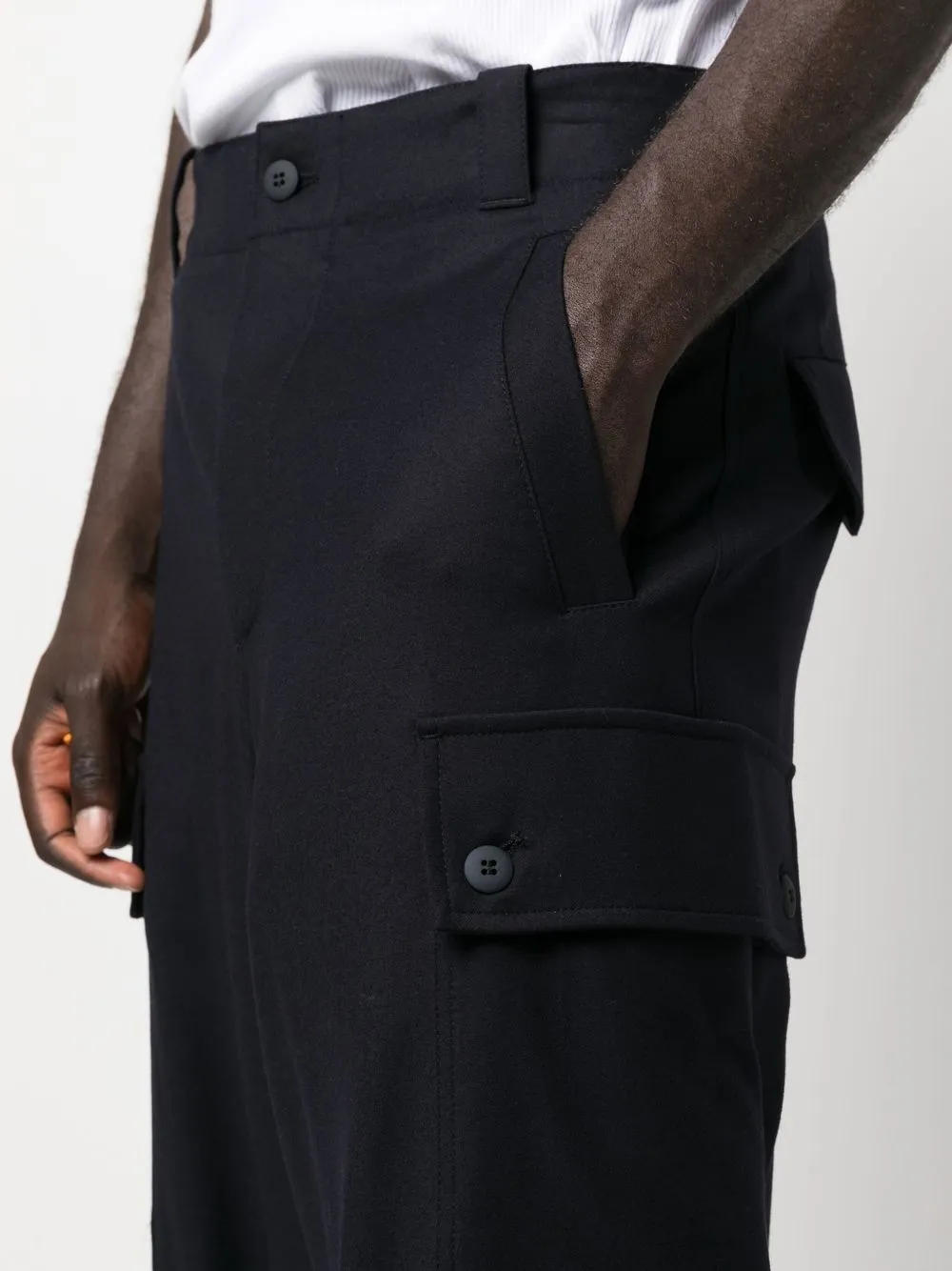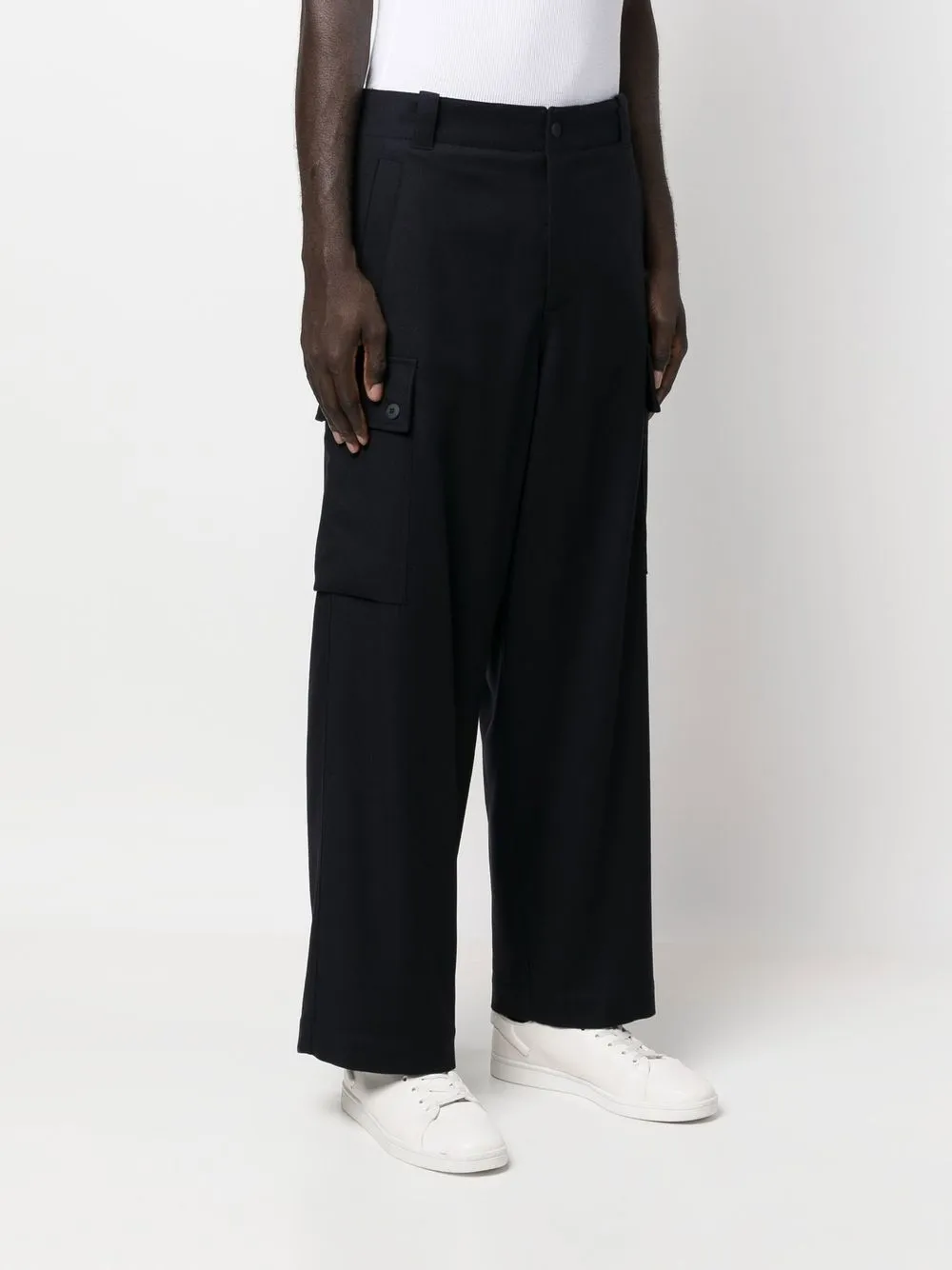 Синий, необработанная шерсть, петли для ремня, застежка на молнии и пуговице спереди, два вшитых кармана по бокам, два кармана с клапанами по бокам, два кармана с клапанами сзади и прямой крой.