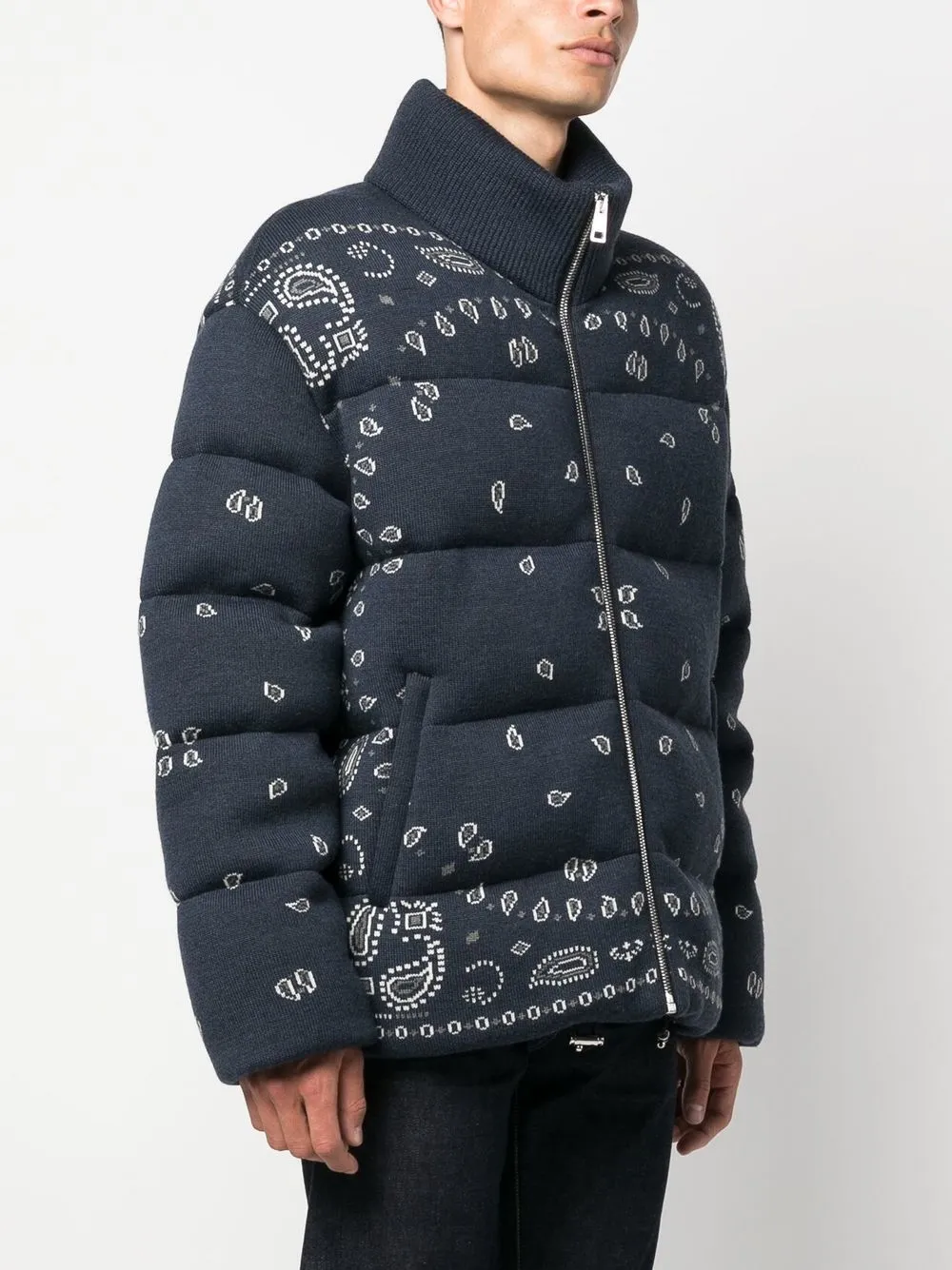 Темно-синий, дутый материал, абстрактный принт, высокий воротник, воротник-стойка в рубчик, застежка на молнии спереди, серебристая фурнитура, два передних кармана с листочкой и длинные рукава.