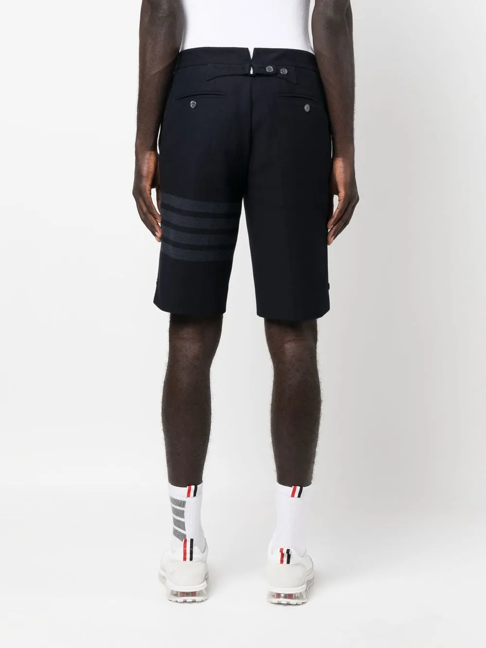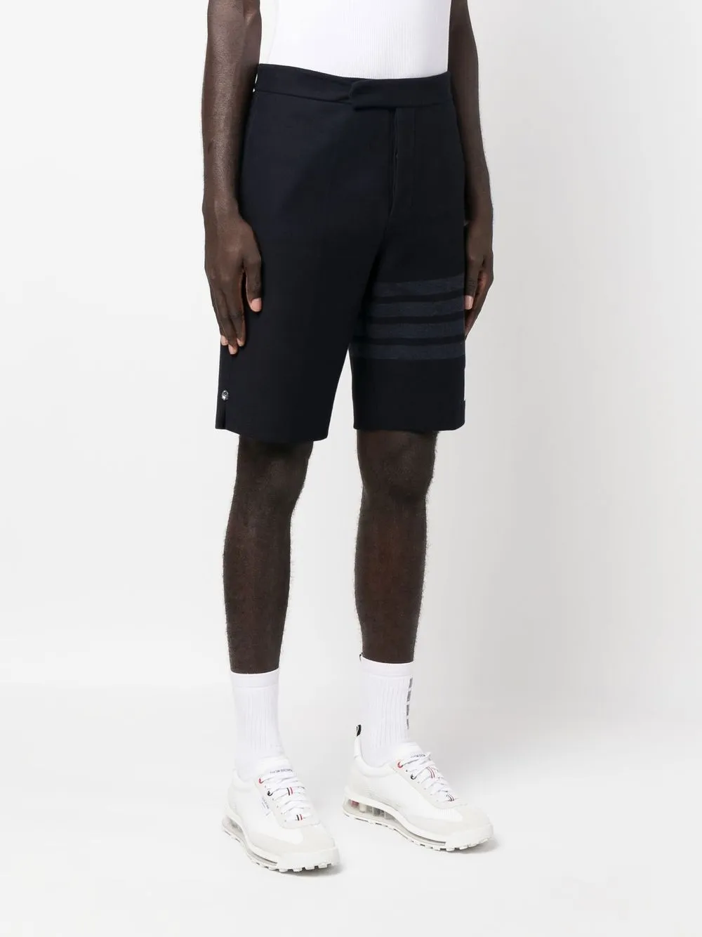 Темно-синий, хлопок, полоски 4-Bar, завышенная талия, застежка на молнии и пуговице спереди, прорезные карманы по бокам и длина по колено.
