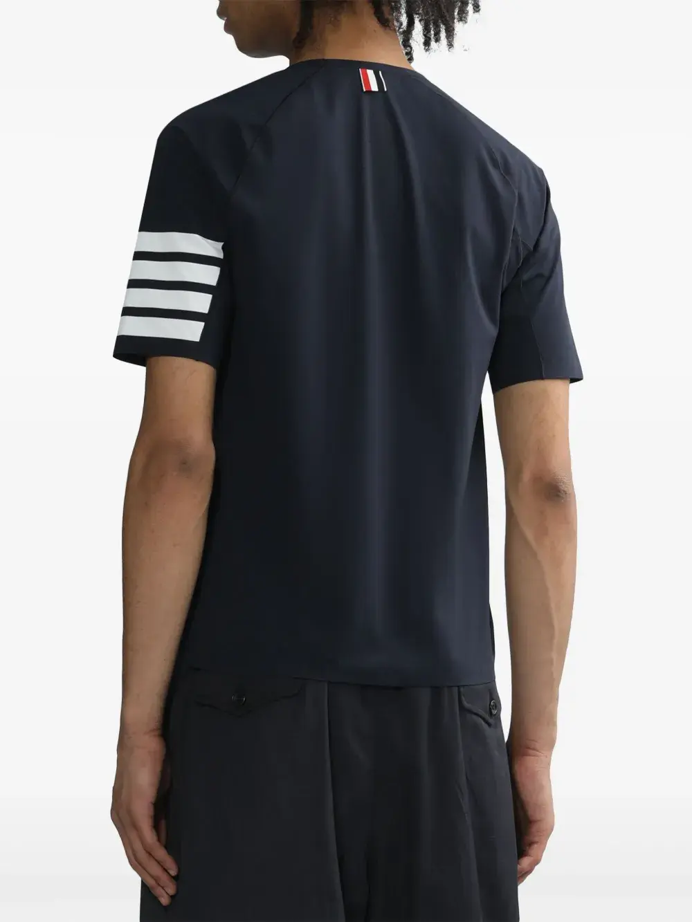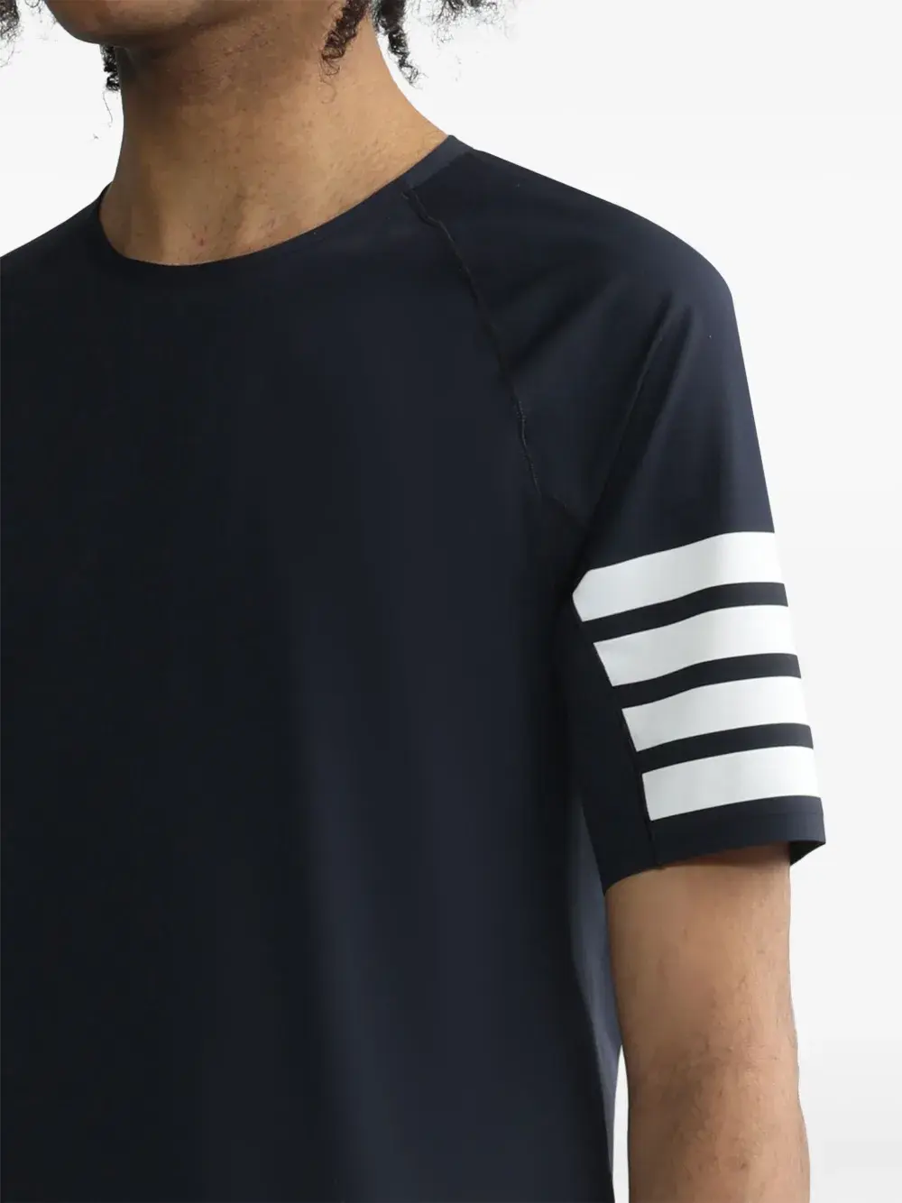 Темно-синий, эластичный материал, полоски 4-Bar, круглый вырез, короткие рукава и прямой подол.