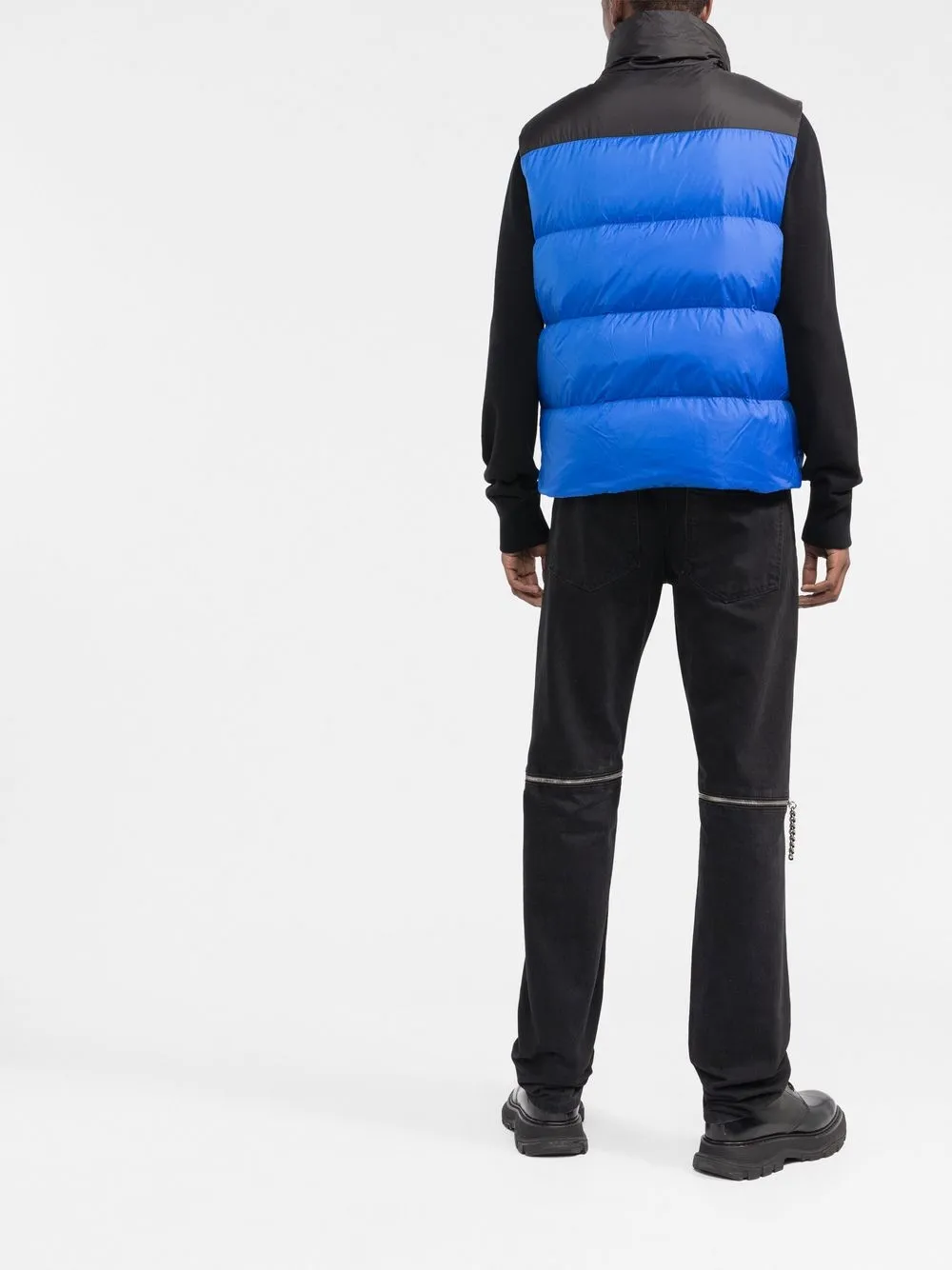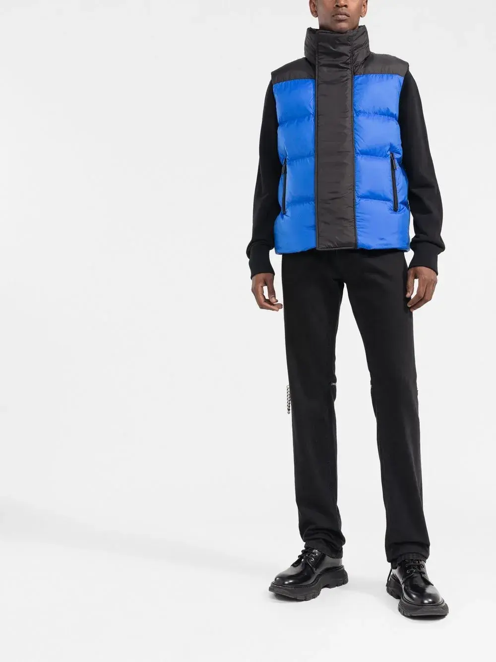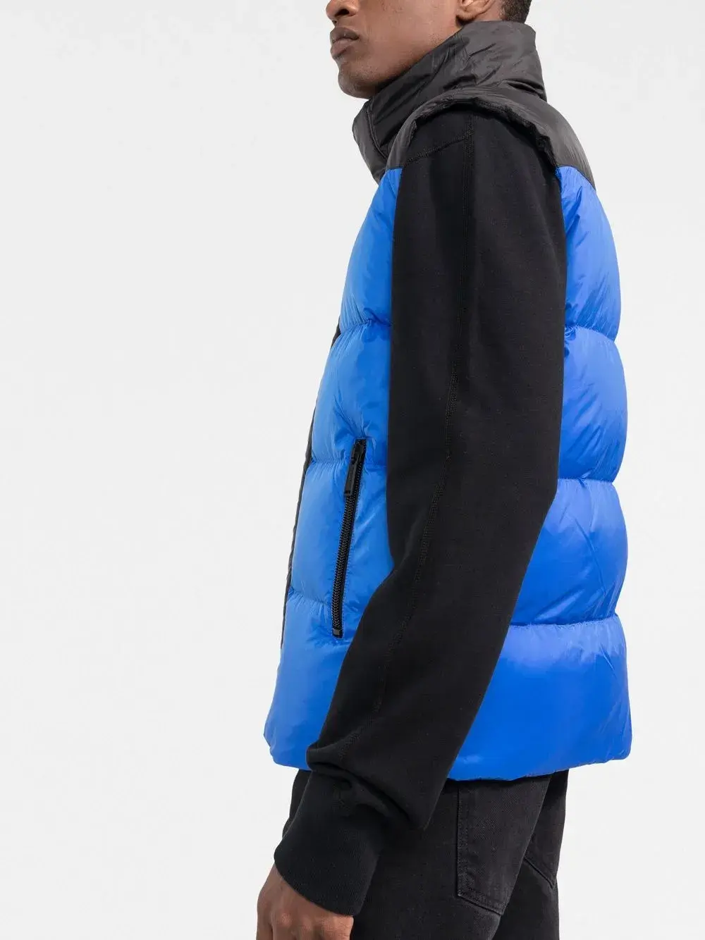 Черный/белый, синий, утиные перья, дизайн колор-блок, дутый материал, логотип спереди, высокий воротник, потайная застежка спереди, два кармана на молнии по бокам, без рукавов и прямой подол.