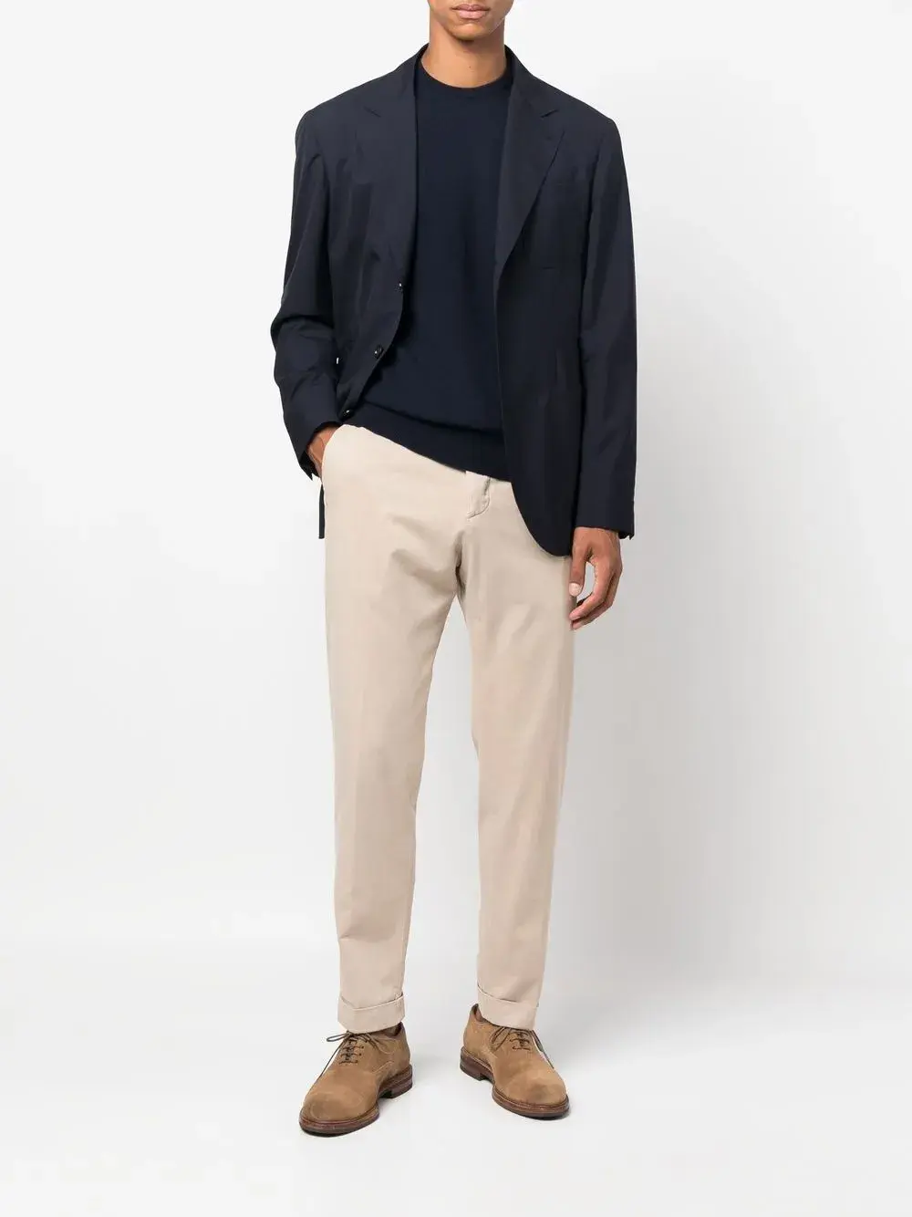 Темно-синий, кашемир, трикотажный материал, длинные рукава, круглый вырез и подол в рубчик.